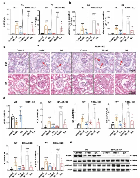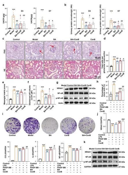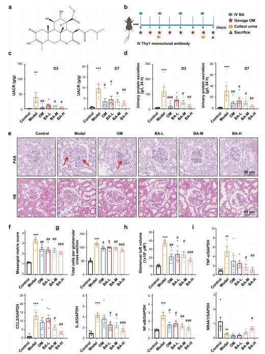 - 体内实验中,BA 可显著降低抗 Thy1 肾炎大鼠的 24 小时尿蛋白量,减轻肾小球肥大和系膜基质沉积;在 NR4A1 敲除大鼠中,BA 的治疗效果完全消失。