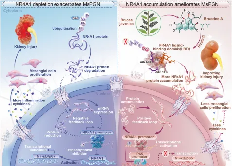 - 机制上,稳定的 NR4A1 可自激活自身启动子,增强对 NF-κB 信号的转录抑制,最终抑制炎症级联反应和系膜细胞增殖。
