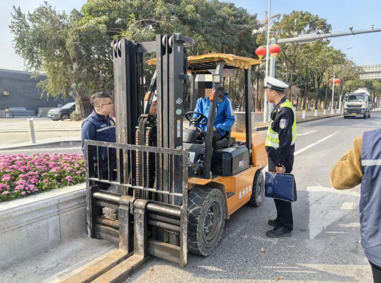 特种设备违规使用: 厂内叉车未办理许可违规上路行驶,存在严重交通安全隐患。