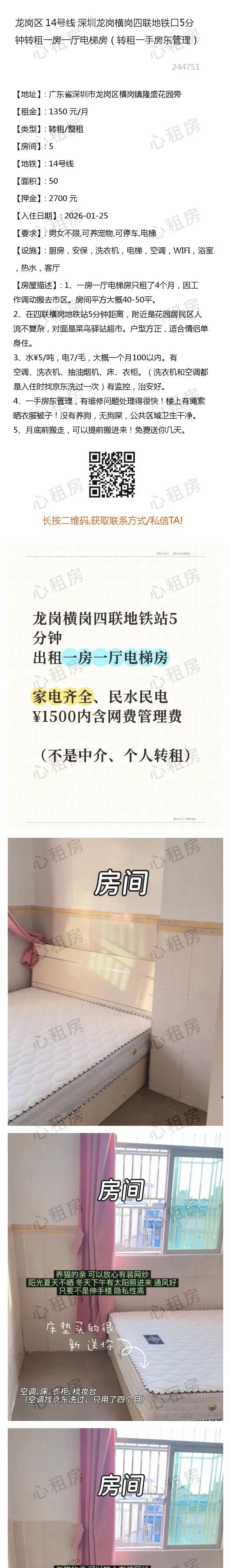 深圳租房【龙岗2则】房源①:14号线深圳龙岗横岗四联地铁口5分钟转租一房一厅电梯房1350元/月;房源②:…