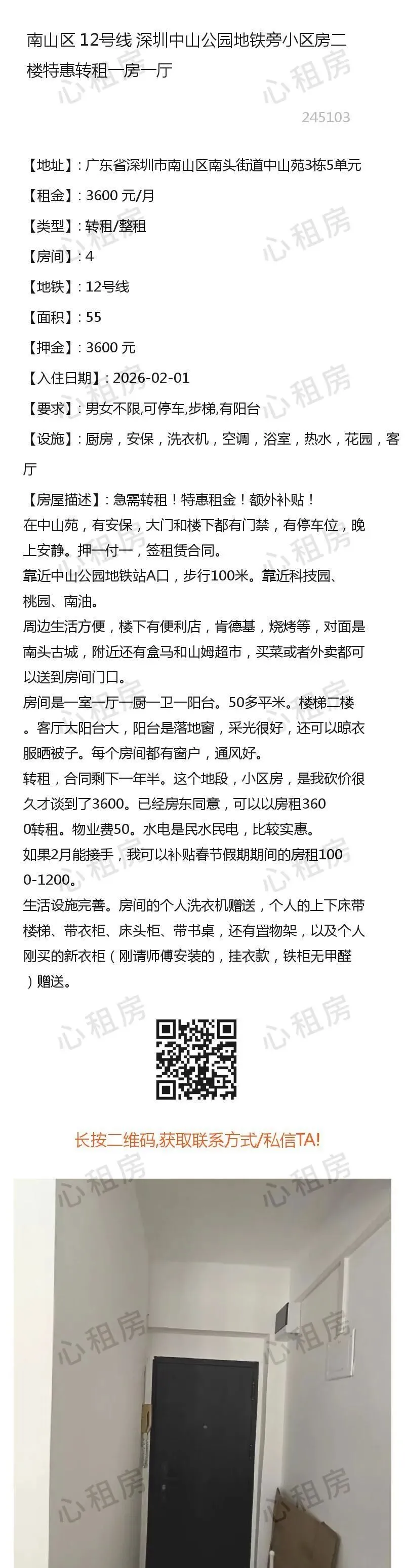 深圳租房【南山4则】房源①:12号线深圳南山中山公园地铁旁小区房转租一房一厅3600元/月;房源②:…