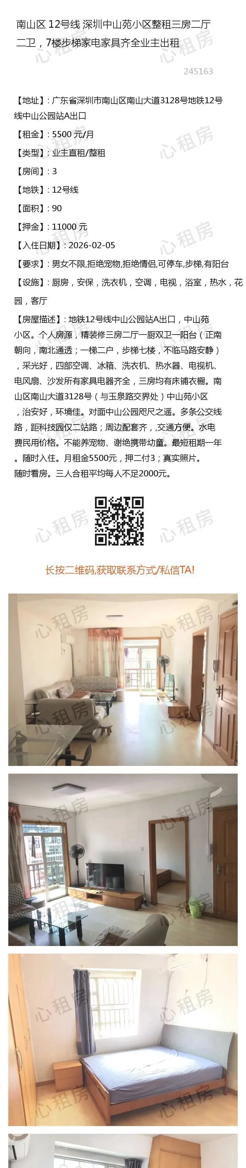 深圳租房>>南山区12号线深圳中山苑小区整租三房二厅二卫,7楼步梯家电家具齐全业主出租5500元/月深圳租房>>南山区1号线房东直租,深圳南山整租一房一厅,近大新/桃园地铁站5400元/月深圳租房>>南山区11号线深圳向南村七坊转租单房1350元/月