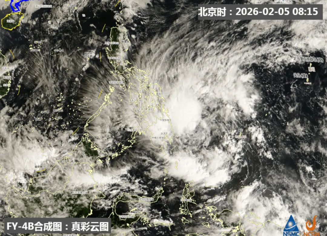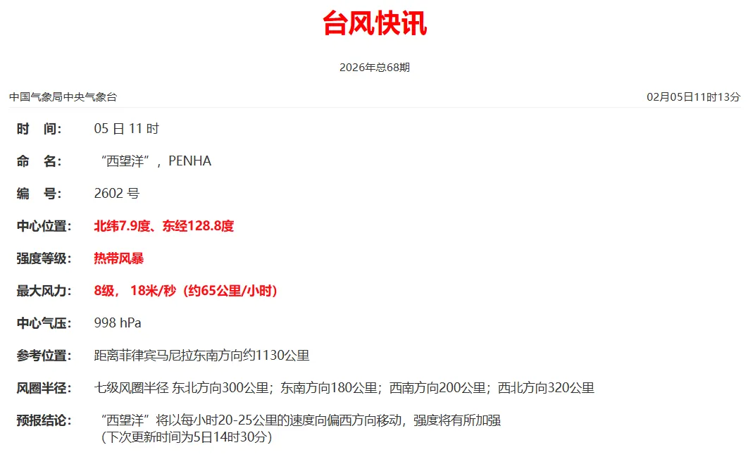 今年第2号台风“西望洋”(热带风暴级)的中心今天(2月5日)早晨11时位于菲律宾马尼拉东南方向约1130公里的洋面上,就是北纬7.9度、东经128.8度,中心附近最大风力有8级(18米/秒),中心最低气压为998百帕,七级风圈半径为180-320公里。