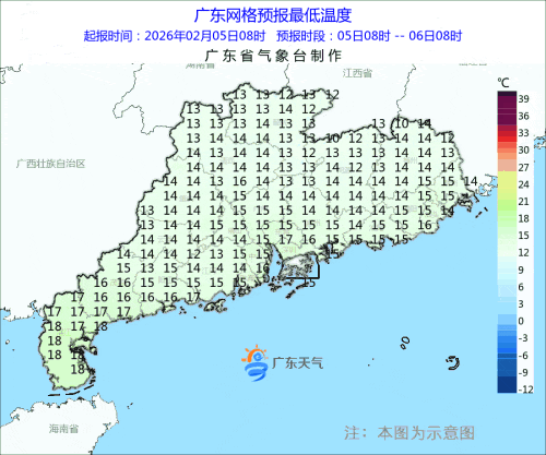 气温降幅:过程平均气温中北部下降6℃~9℃,南部下降3℃~5℃;过程最低气温出现在8日或9日早晨,粤北部分市县有5℃以下低温,高海拔山区1℃~3℃,局部有霜(冰)冻,广州过程最低气温9℃左右,10日起气温逐渐回升。