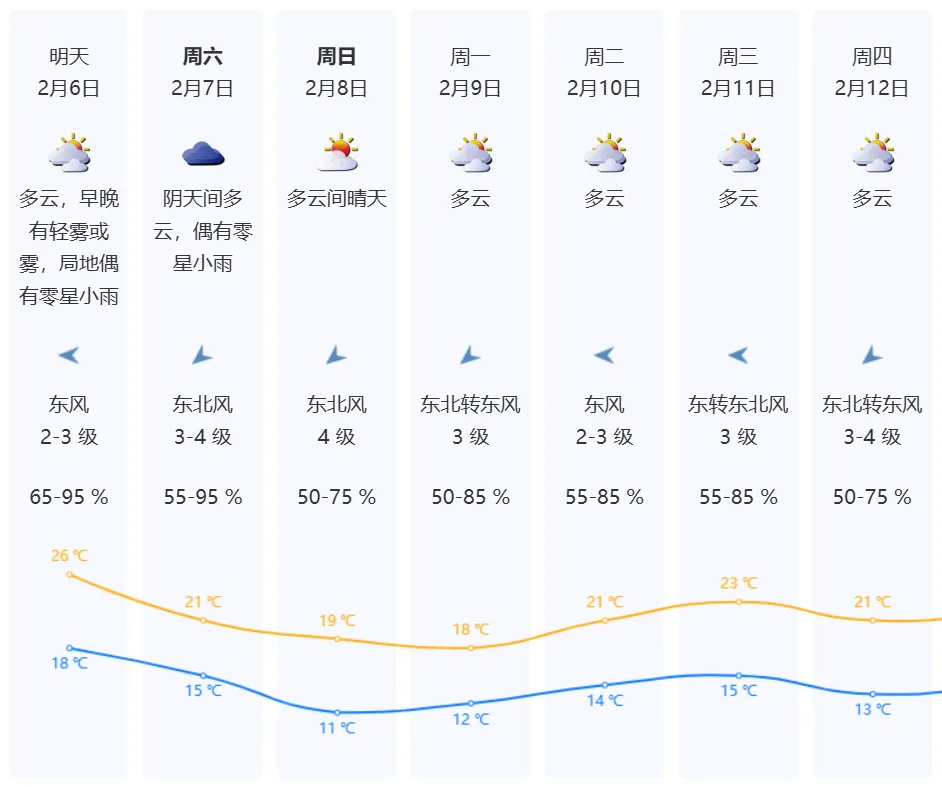预计6日多云,局地偶有零星小雨,早晚有轻雾或雾,能见度下降,气温18-26℃;