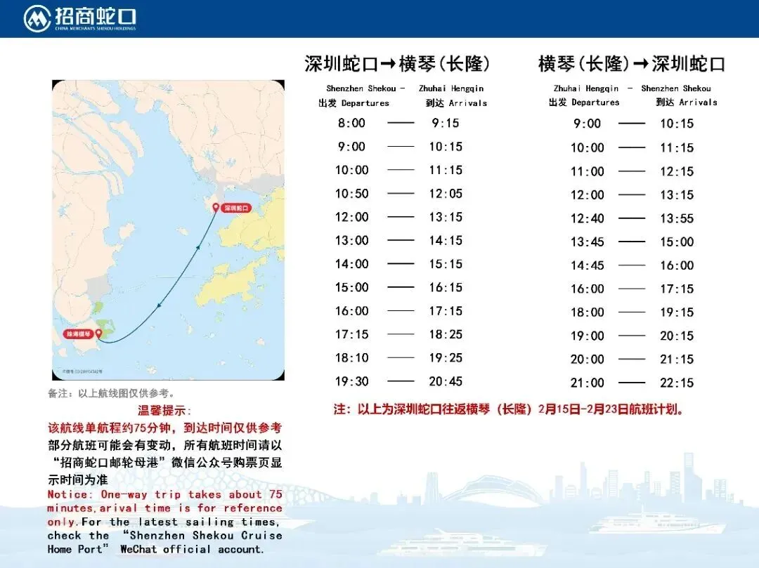 深圳蛇口-横琴(长隆)航线 航程约75分钟,每多班往返,覆盖全天出行需求。为乘船旅客贴心安排接驳车,5分钟车程即达长隆海洋王国,带娃家庭、甜蜜约会无需奔波。