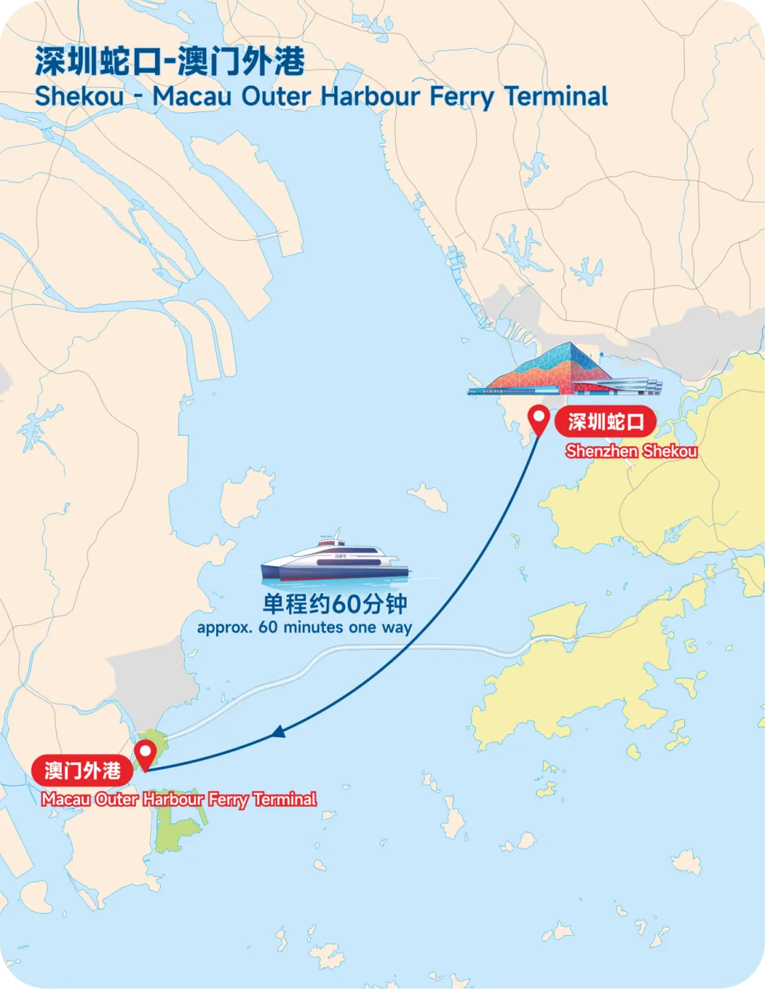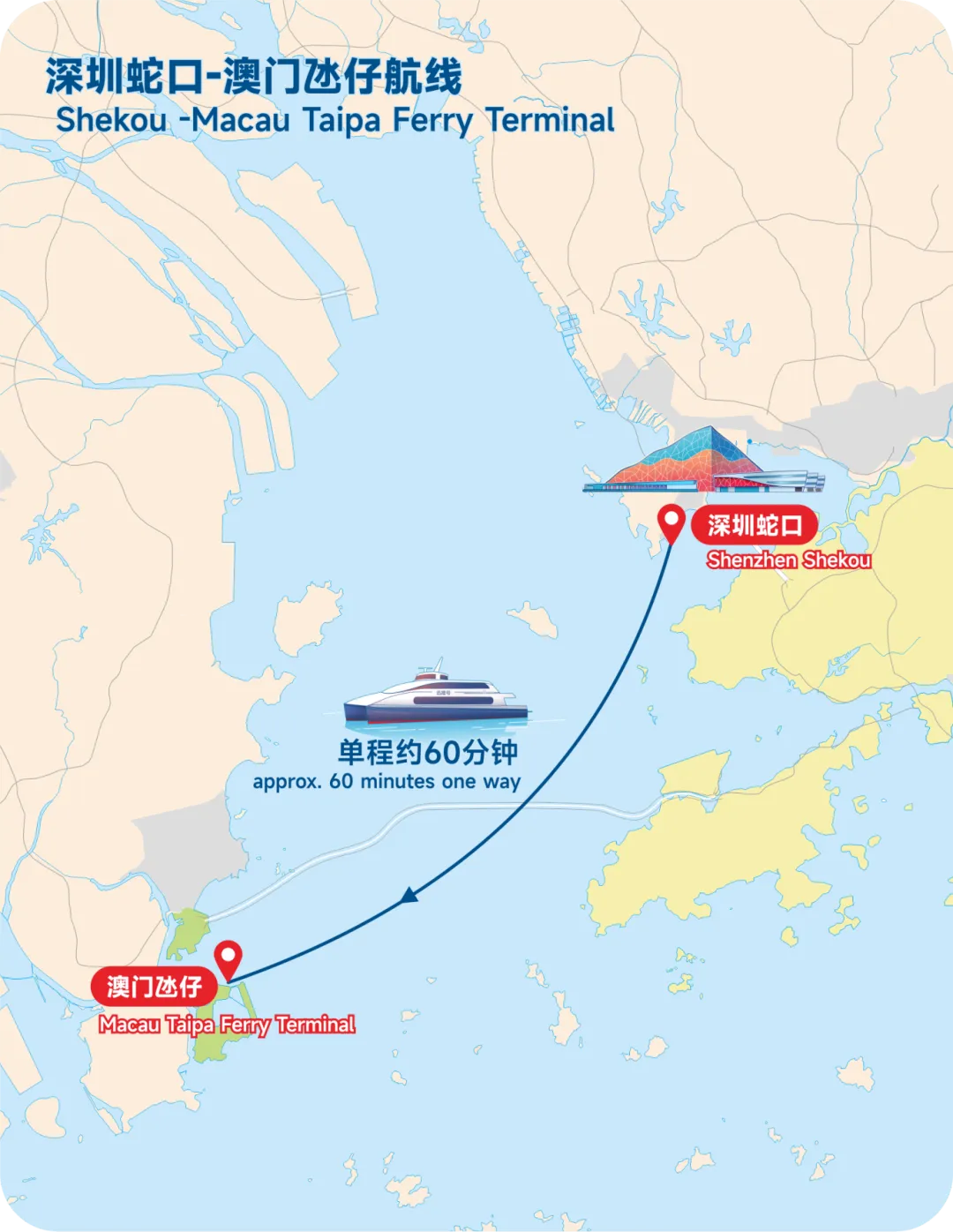 深圳蛇口-澳门氹仔航线 航程约60分钟,直达澳门核心区域,比陆路节省1.5小时以上。下船能乘坐伦敦人、威尼斯人等酒店接驳车直达对应地点~~
