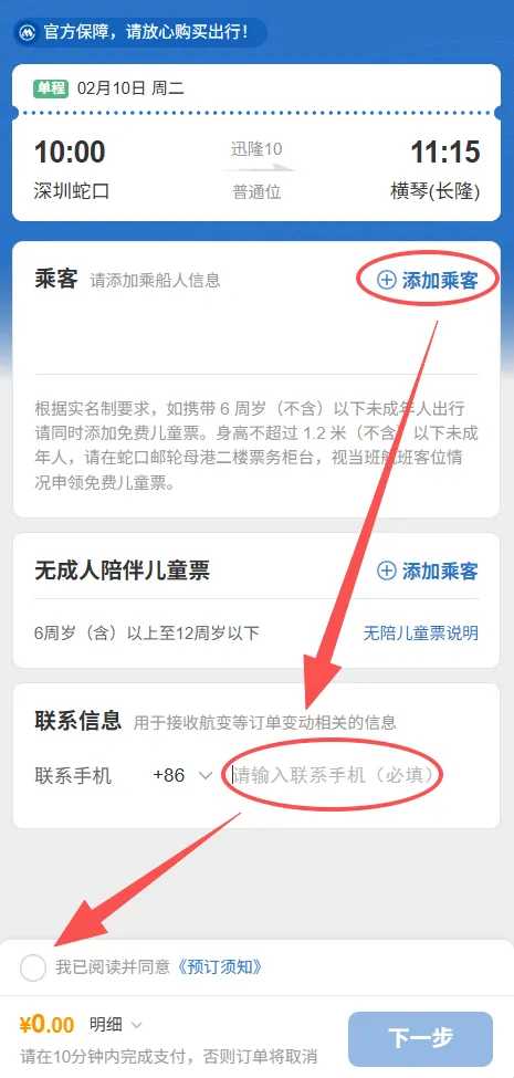 可为亲友一键订票:船票热售中,建议提前订票锁定座位。预先填写乘船人姓名证件号等信息,一键提交订单,节省操作时间。操作流程参考下图(以横琴航线为例)