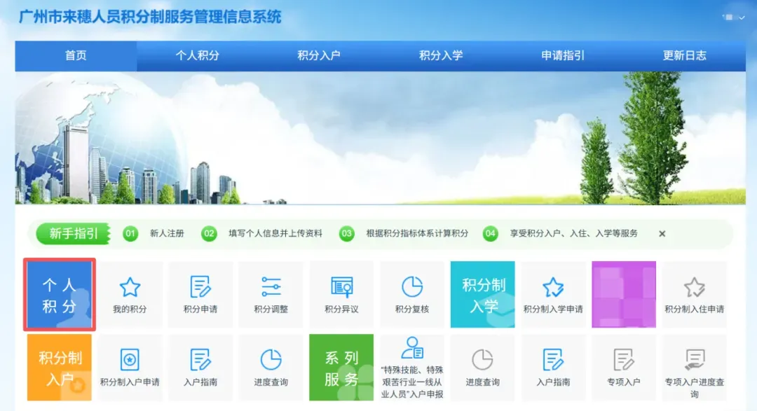 通过电脑登录“广州市人力资源和社会保障局”官网,点击“业务专题”—“就业创业”—“积分制服务”—“广州市来穗人员积分制服务管理信息系统”。