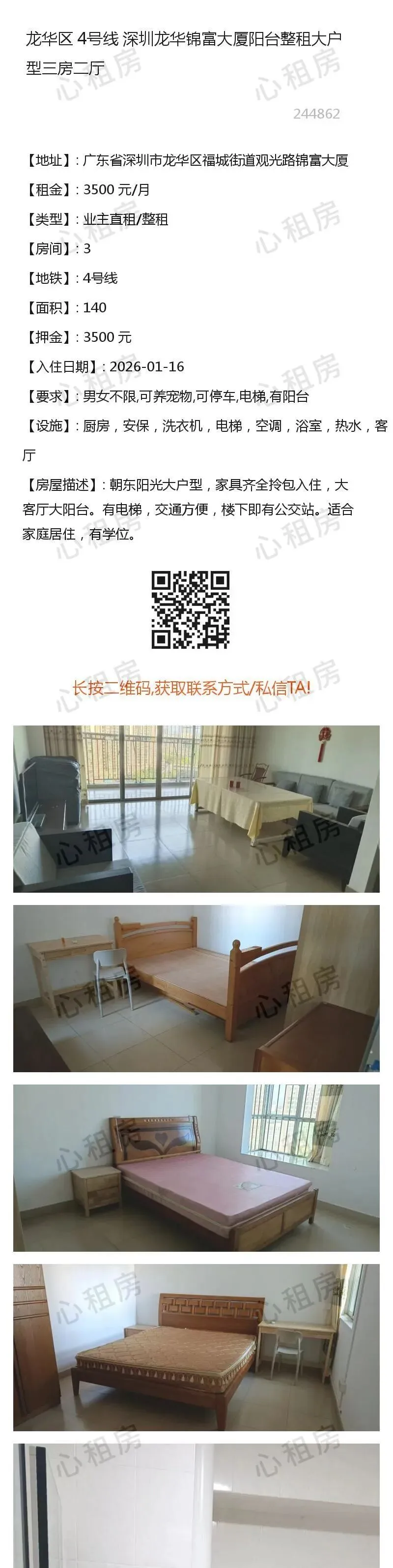 深圳租房>>龙华区4号线深圳龙华锦富大厦阳台整租大户型三房二厅3500元/月