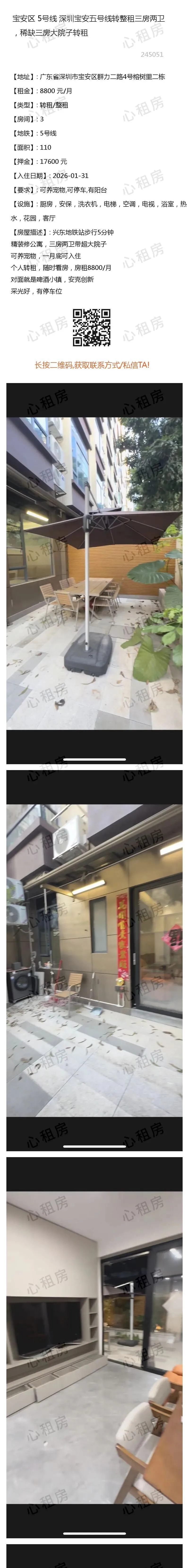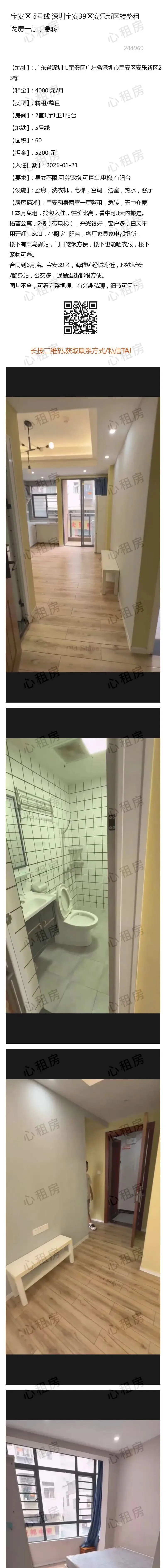 深圳租房【宝安5则】房源①:1号线深圳宝安坪洲麻布新村转整租两房一厅3400元/月;房源②:…