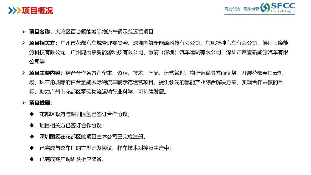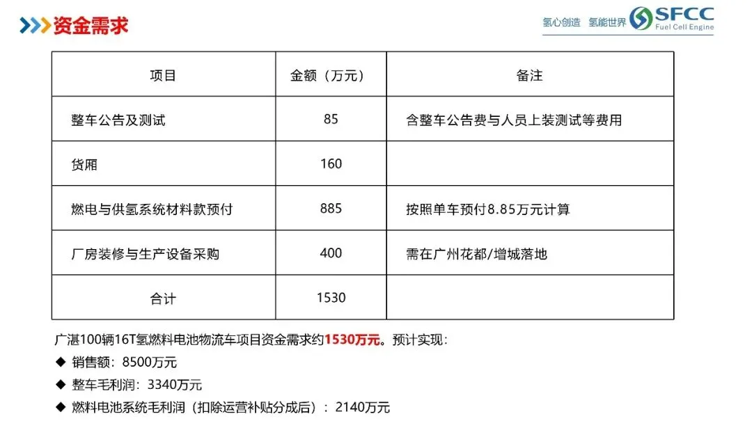 这是大湾区百台氢能城际物流车辆示范运营项目,广湛100辆16T氢燃料电池物流车项目资金需求1530万元。公司已和花都区政府与深圳国氢已签订合作协议,深圳国氯在花都区的项目主体公司已完成注册,已完成与整车厂的车型开发协议、样车技术对接及生产中,已完成客户调研及相应储备。#公关鸟投资人交流圈