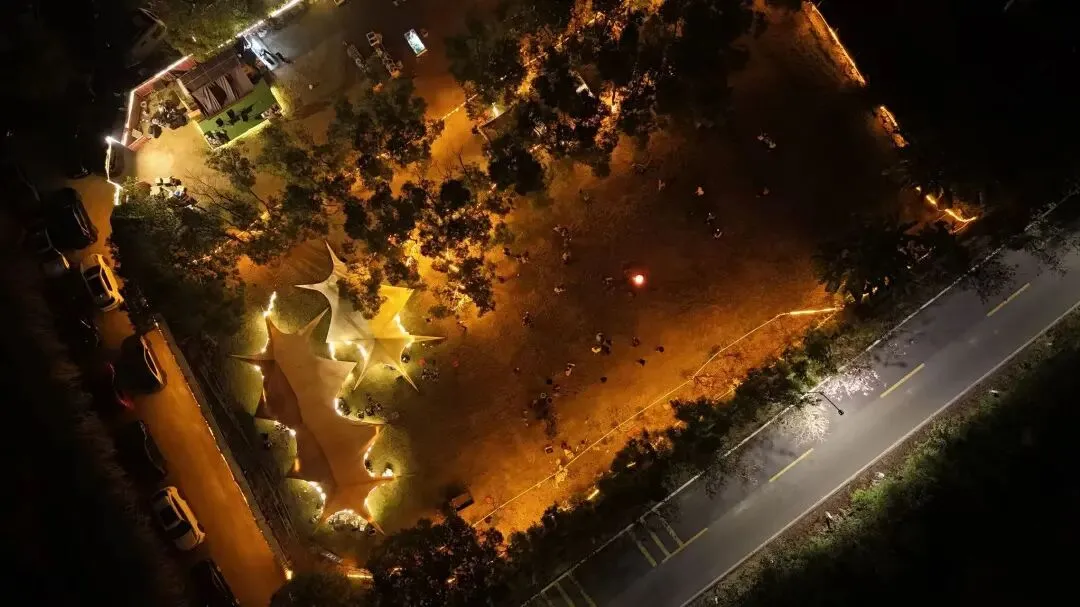 🍃星空露营BBQ:夜晚亮灯超有氛围感💡,听现场音乐🎶、吃烤肉聊天,这才是团建该有的样子啊~