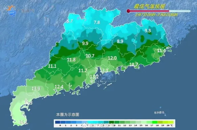 气温降幅方面,过程平均气温中北部下降6~9℃,南部下降3~5℃;过程最低气温出现在8日或9日早晨,粤北部分市县有5℃以下低温,高海拔山区1~3℃,局部有霜(冰)冻,广州过程最低气温9℃左右,10日起气温逐渐回升。
