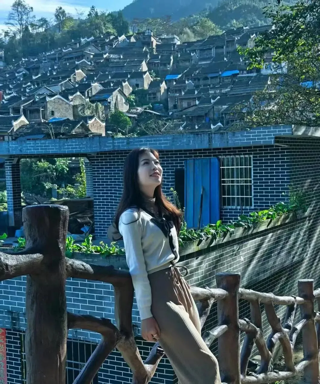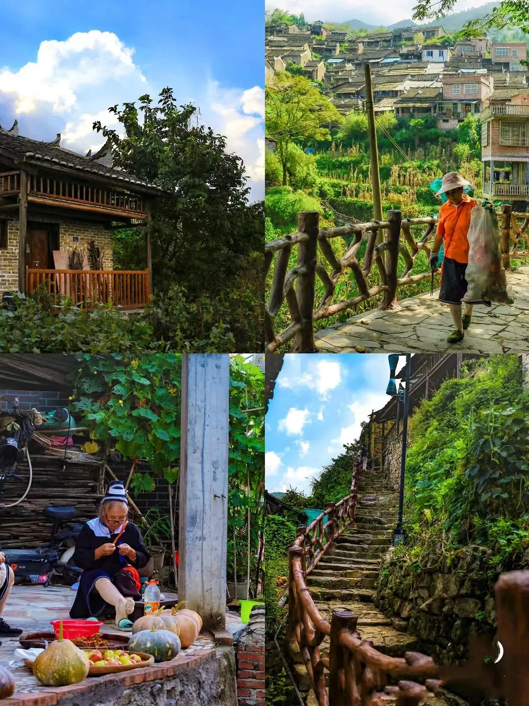 15:00左右油岭瑶寨徒步,由于油岭瑶寨尚未开发,比较原生态,路比较窄小,大巴不能开进去,需要徒步半个小时左右到寨里,然后开始摄影拍照(山下瑶寨房屋多是青砖木瓦、底层用石头砌成,木桩加固支撑顶层。二层外面,木头和栅栏围起来一个小院,摆上石桌石凳,闲来聊天。寨子内石板巷道纵横交错,将家家户户连接起来。