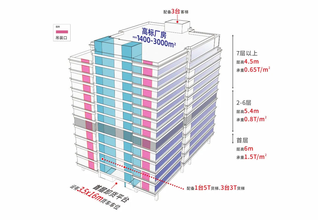 合理的层高设置,便于生产、实验以及研发办公的垂直分区,形成完整的产业链条: