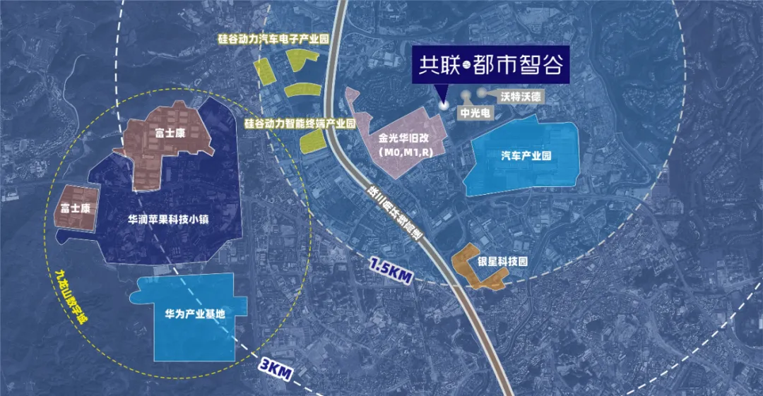 一路之隔的两大百亿产业基地,中光电(新型显示器智能制造中心)、沃特沃德(新一代移动终端智能制造基地)与项目同期建设;周边还有富士康产业园、硅谷动力产业园、华润苹果科技小镇、美团大湾区基地等。