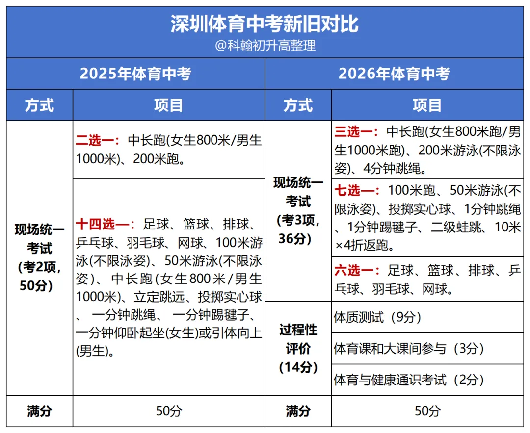 今天,蒋老师给大家梳理下2026年深圳体育中考政策,附各项目评分标准、考试要求和演示视频!