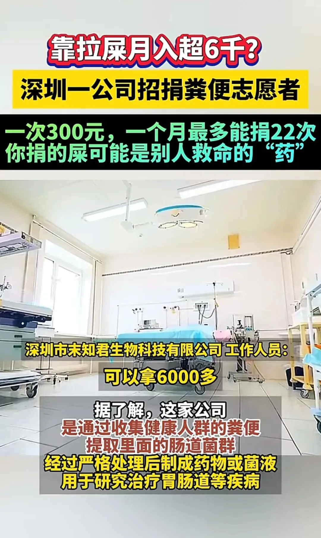 在深圳未知君生物科技有限公司的招募海报上,“一次300元,月入最高6600元”的字样格外醒目。按照这个标准,只要每月能捐22次,就能轻松实现“拉屎自由”。消息一出,网友们的反应堪称炸裂:有人调侃“这是我离月入过万最近的一次”,有人戏称“我要捐到他们破产”,还有人认真询问“成都地区能报名吗?”