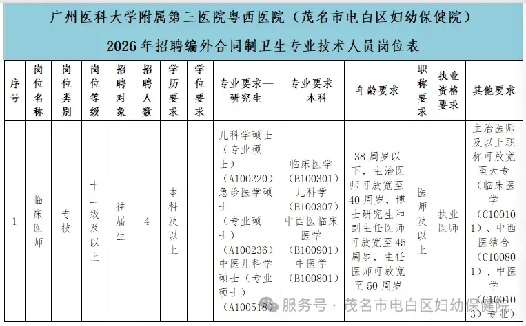 3.年龄、学历、资格要求详见广州医科大学附属第三医院粤西医院(茂名市电白区妇幼保健院)2026年招聘编外合同制卫生专业技术人员岗位表;
