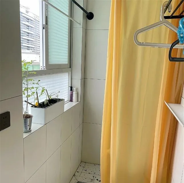别小瞧厨房和卫生间的设计,咱们行业里常说:“麻雀虽小,五脏俱全。” 这个厨房窄是窄,但用白色墙面加黑白地砖,视觉一下就亮起来了。门上的布帘,挡油烟又可爱,还点缀了空间。玻璃推拉门一关,油烟味说拜拜,就是这么讲究!