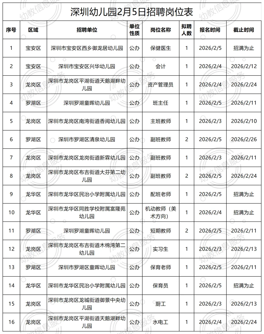 >【深圳幼儿园招聘】保健医生、会计、主班副班教师、机动教师、实习生、资产管理员、保育员、厨工、水电工招聘|幼儿园2月5日招聘汇总