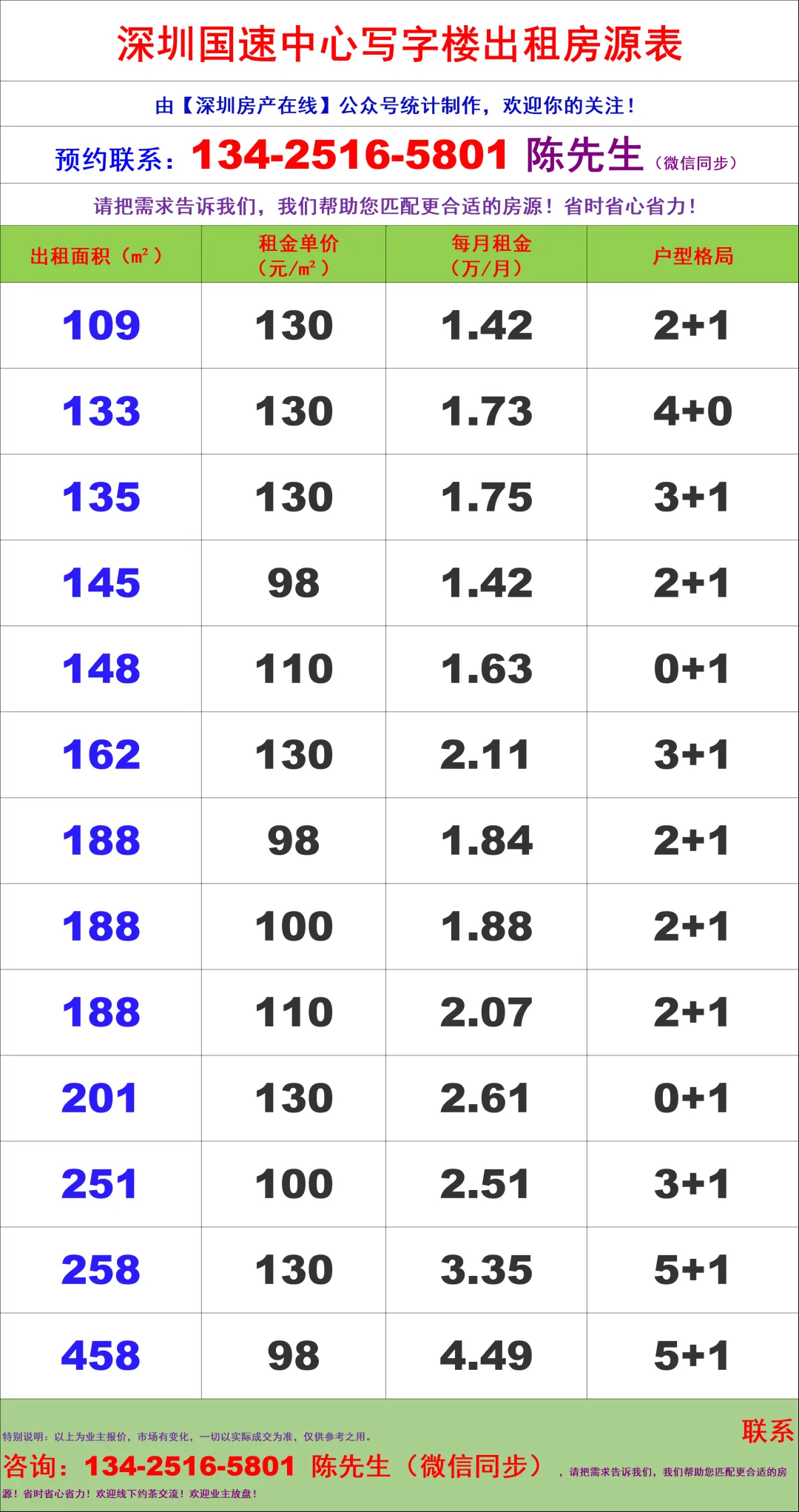 【深圳房产在线】陈经理写字楼租售团队:134-2516-5801(微信同步)