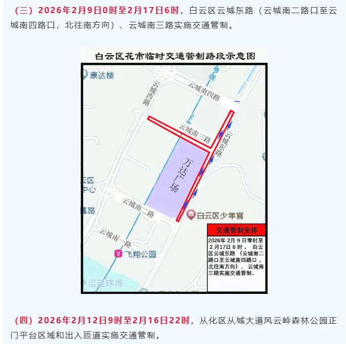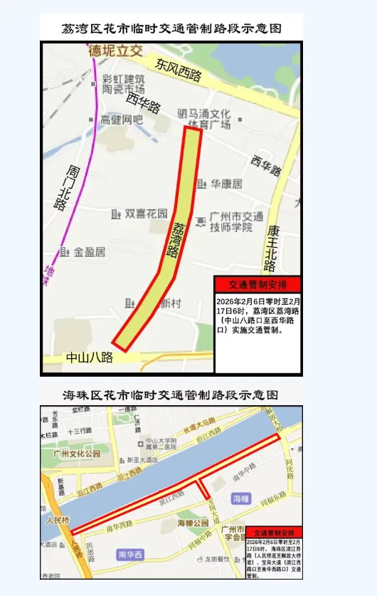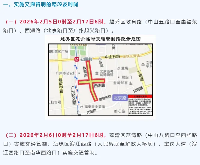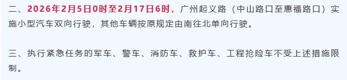 宝子们!记者刚从广州交警处了解到,为保障2026年广州传统迎春花市顺利举行、交通有序,广州交警将依《道交法》对部分道路临时管制啦!2月5日起,越秀、荔湾等多区多路段分时段禁行,途经车辆要绕道。2月5 - 17日,广州起义路部分路段小型汽车可双向行驶。军车等执行紧急任务的不受限。大家去花市提前规划,尽量选公共交通,听指挥通行哟!