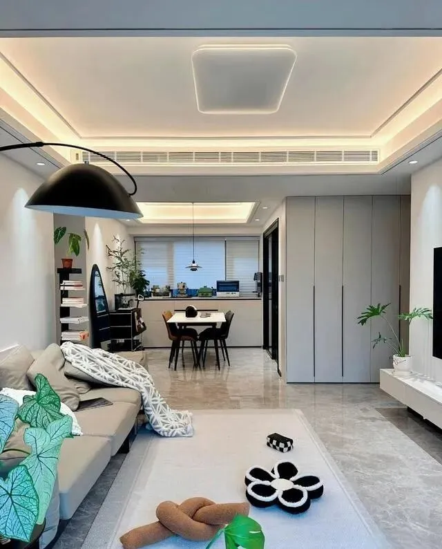 客餐厅分别做了吊顶 , 区域划分很清晰 , 地面铺灰色瓷砖 , 耐脏 , 墙面通刷乳胶漆 , 简单干净 , 没搞什么花里胡哨的 , 反而越看越舒服。