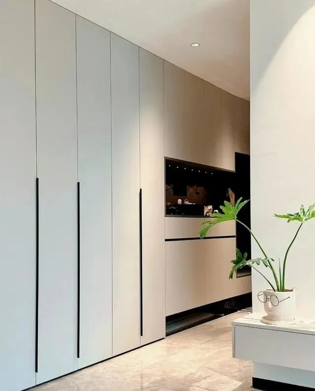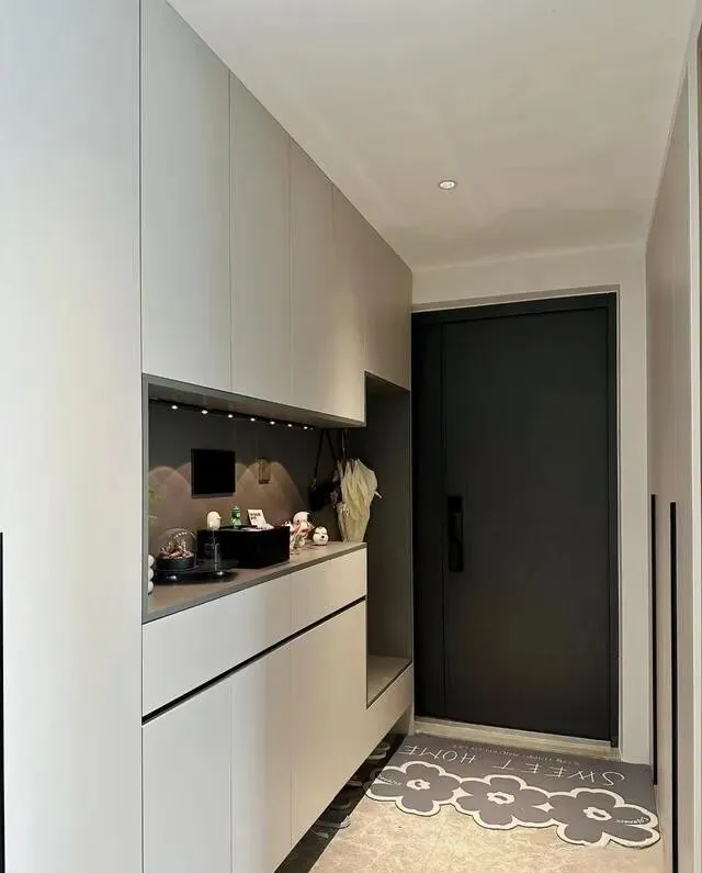 玄关是个狭长过道 , 两边全做了柜子 , 收纳能力直接拉满。