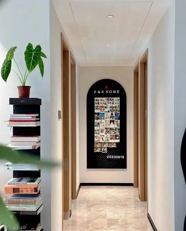 对了 , 大门正对卧室过道那面墙 , 做了个拱形照片墙 , 定格了生活里的小幸福 , 也化解了一进门直对墙面的压抑感。
