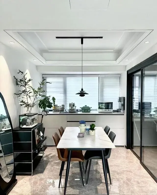 飘窗改成餐边柜 , 四个抽屉 , 台面放饮水机电饭煲 , 拿取方便 , 中间摆了张白色岩板餐桌 , 配灰色和棕色餐椅 , 头顶一盏飞碟灯。