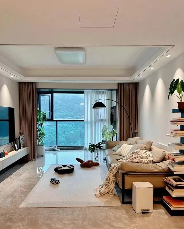 沙发背景墙上装了小山丘射灯 , 简单但氛围感很足 , 灰色皮沙发是直排的 , 不占地儿 , 下面铺米色地毯 , 没买茶几 , 活动空间大多了。
