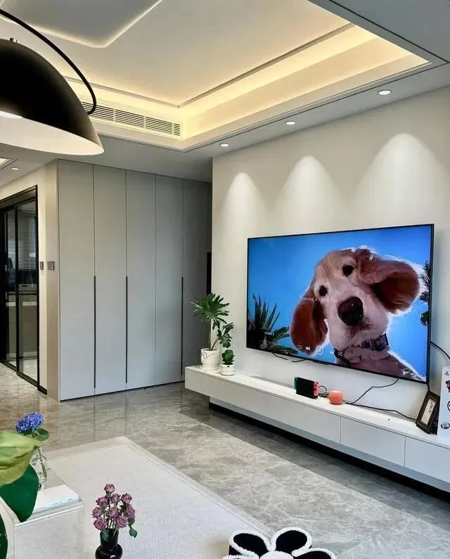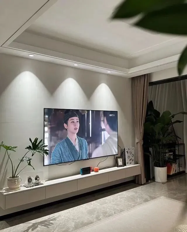电视墙也是啥造型都没做 , 灰色乳胶漆 , 小山丘光源 , 悬空电视柜。