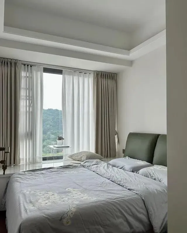 卧室刷白墙 , 干净明亮 , 窗帘用的灰白拼接款 , 大方又显气质。