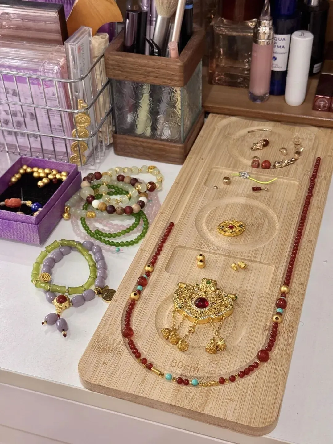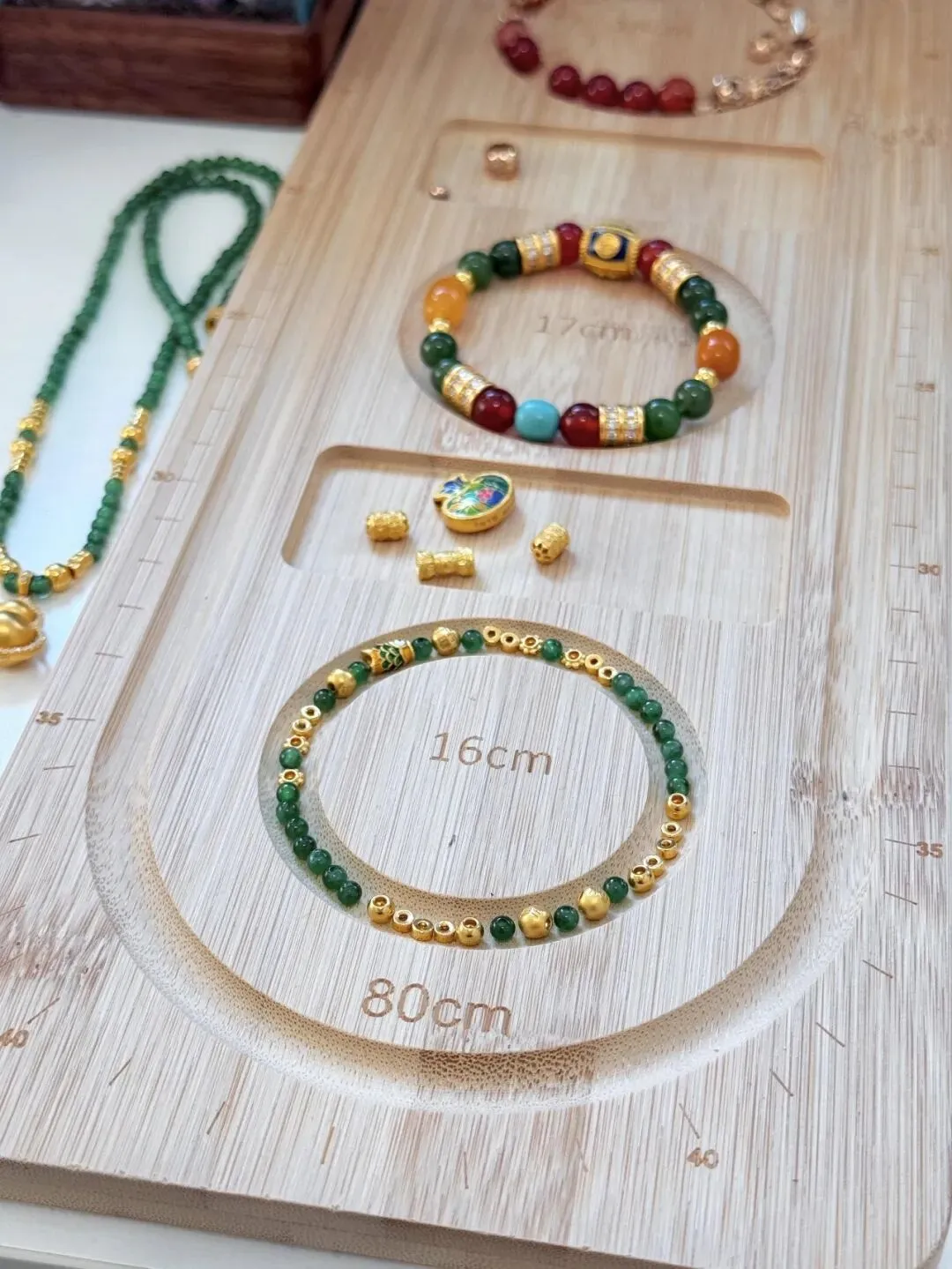 晚上脱掉首饰丢回收纳盒 听着桌面上小金珠磕碰的声音 还有点解压 现在回头看 当初死犟着要去柜台试各路大师新款 其实有点像买限定色口红 满足自己那一阵的新鲜 过段时间还是会更回到适合自己肤色和风格的经典款 佩戴场景理清楚 比什么寓意或者工艺更香 长期戴我还是觉得10g-20g这种小克重串串最好穿衣 不会怕重 不容易滑掉 坦白说这样一串手链加上各种溢价确实不能当纯投资的东西看 我偶尔也会被高工费吓到 偶尔还是忍不住冲动消费 但这就是生活嘛…