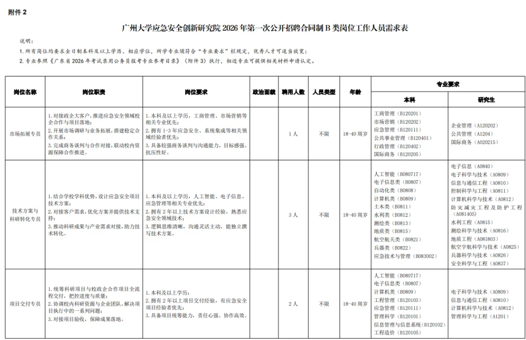 附件2:广州大学应急安全创新研究院2026年第一次公开招聘合同制B类岗位工作人员需求表.pdf