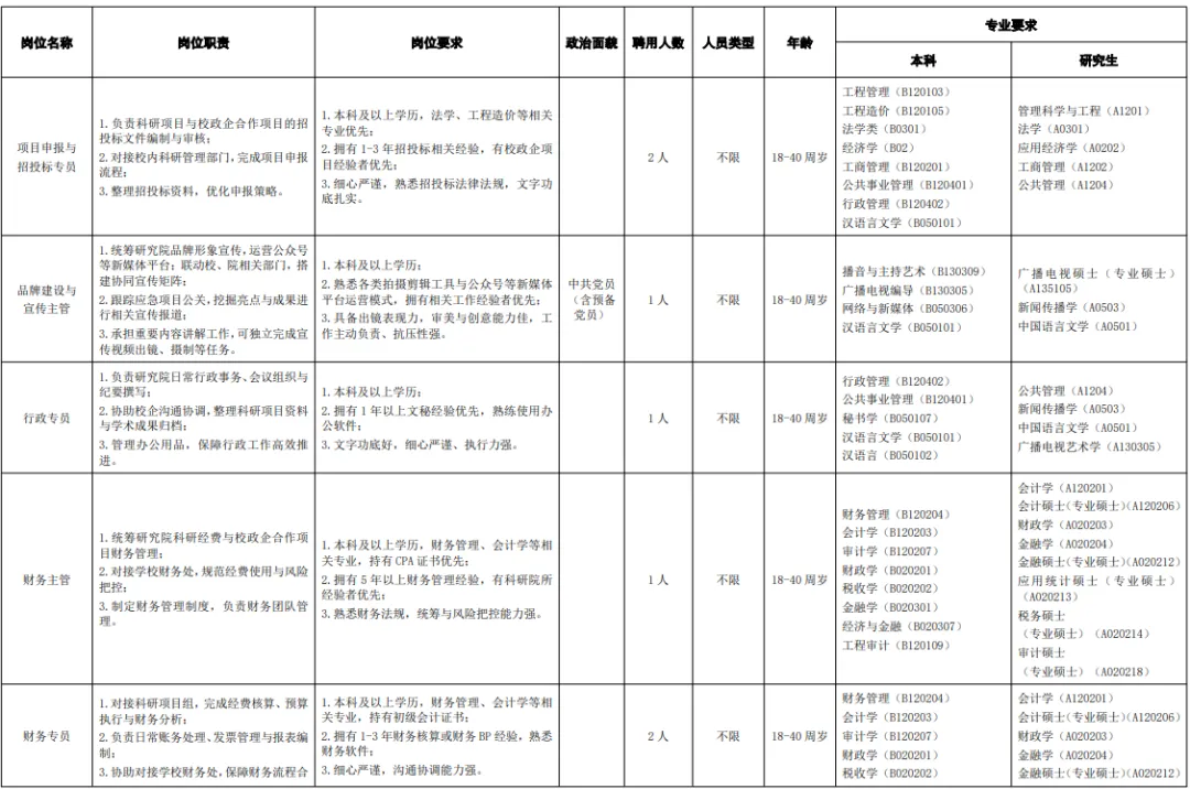本次公开招聘工作人员共13名,具体岗位、核心职责等详见(附件2)《广州大学应急安全创新研究院2026年第一次公开招聘合同制B类岗位工作人员需求表》。