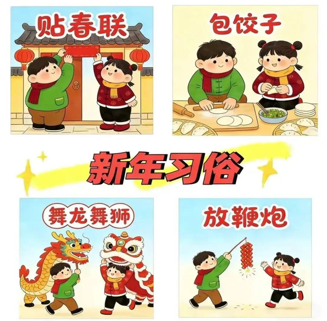 春节期间,可带孩子了解贴春联、剪窗花、扫尘、吃年夜饭等传统年俗,鼓励孩子参与贴福字、包饺子等家务小事,感受浓浓的节日氛围。引导孩子给长辈拜年、说吉祥话,学会感恩与祝福,传承中华传统美德。