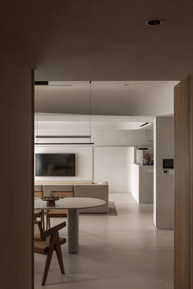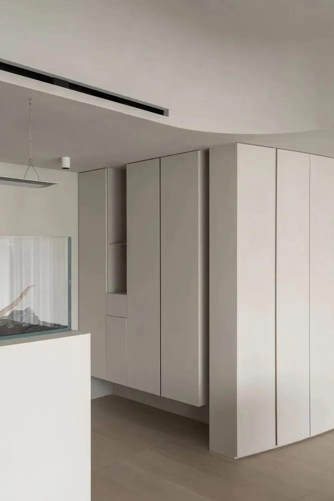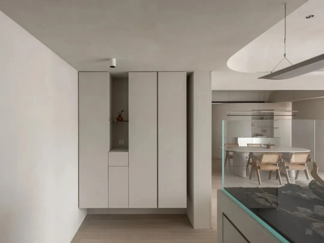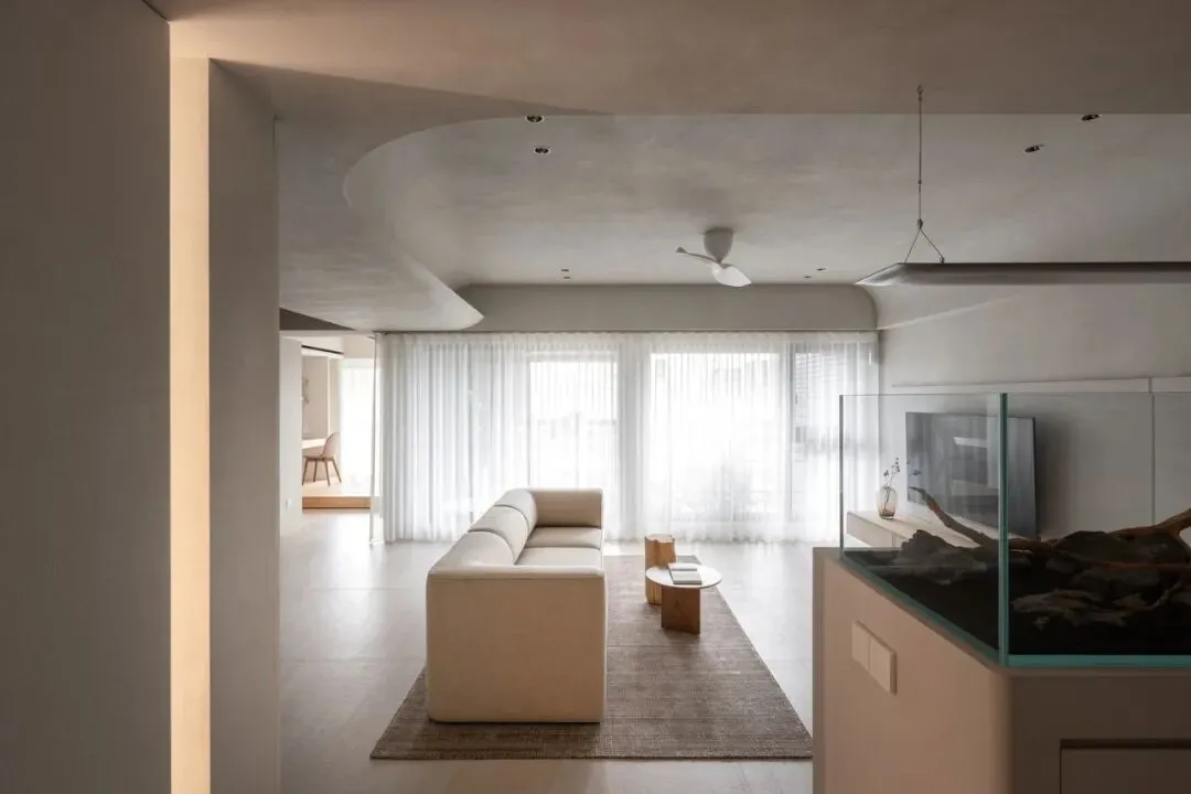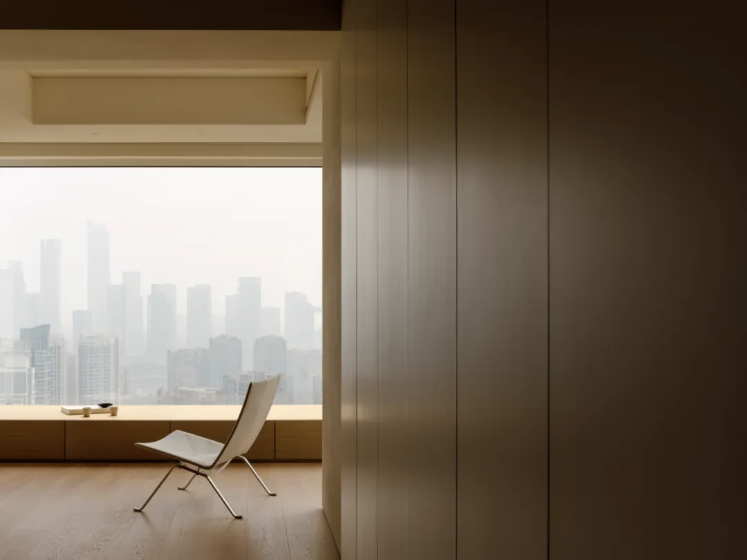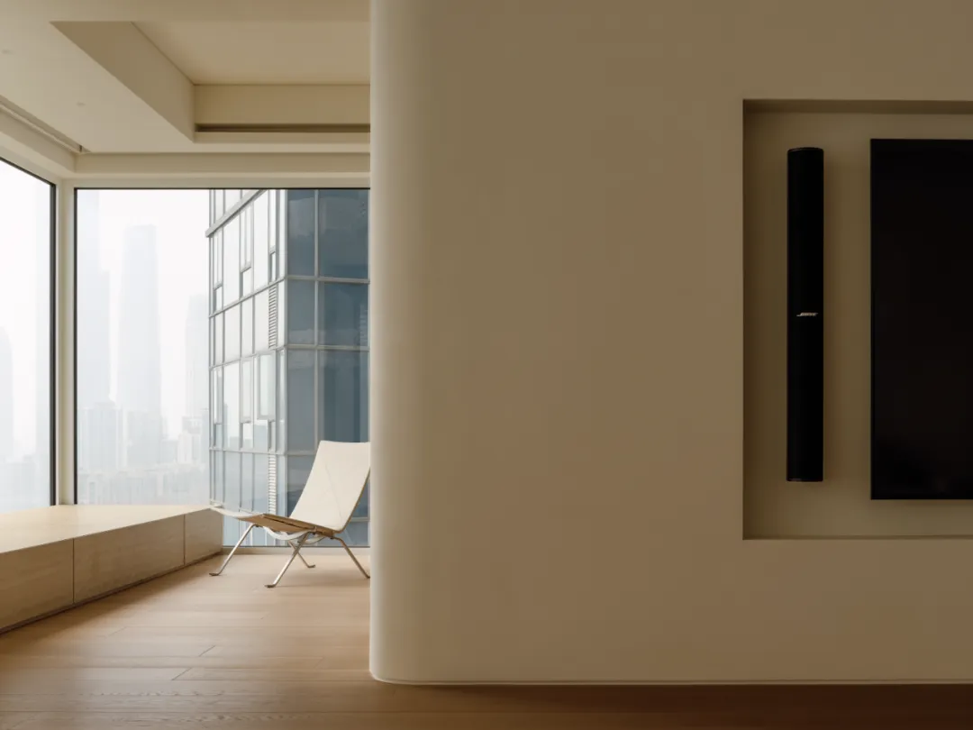 好的东西,是会引起共鸣的。好的空间,是会让人暂时卸下防备顺势躺在沙发上然后长叹一口气,让人在繁杂生活里依旧拥有一颗平静的心。当我第一次看到这个空间的时候,我感受到了洗完澡吹完头发的清爽,还有假期刚开始的松弛感,或许我们的理想不同,但那份对归处安宁的渴求始终相通。原方正客厅打通邻间与阳台,打造洄游式的空间,将电视墙连通客厅、书房与茶室;拆除玻璃隔断,扩大景观视野,日常收纳归入书房柜体,保持空间简约通透,如此一来,增添了更多不同生活场景的可能,加深生活的自在,减少生活的繁杂。广州私宅,250㎡。以城市美景作窗画,以线条描述结构,以浅色衬托色彩,以温柔赋以温度,以自然给予灵动。一切都是刚刚好。设计之前,设计师说:目前您比较喜欢什么样的生活方式或者想要参考什么样的空间案例呢?业主说:我现在就处于一个‘做减法’的人生阶段,孩子大了,家人的工作和生活也都稳定了,以前住的空间都是千家万户的大多数,现在就想改变一下,甚至是突破自己,希望给自己和家人一个全新的生活方式,如果非要我给出要求的话,我就希望我回家以后是可以赤脚走在家里,随意靠在墙边或者坐在家里的某个地方,我内心平静一点点,我的身体舒展一点点。“不设限”这三个字不仅是业主的信任,对设计师来说,动力和压力同时扑面而来。干湿分区以透光移门隔断,增设水波纹艺术移门双重闭合,日常透光通透明亮,高隐私需求时双重门全闭隔绝,满足不同人的隐私需求。△平面图