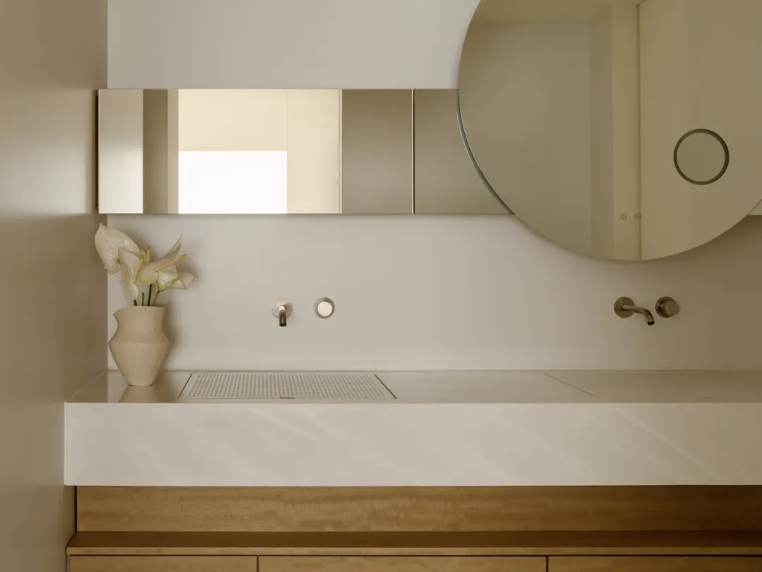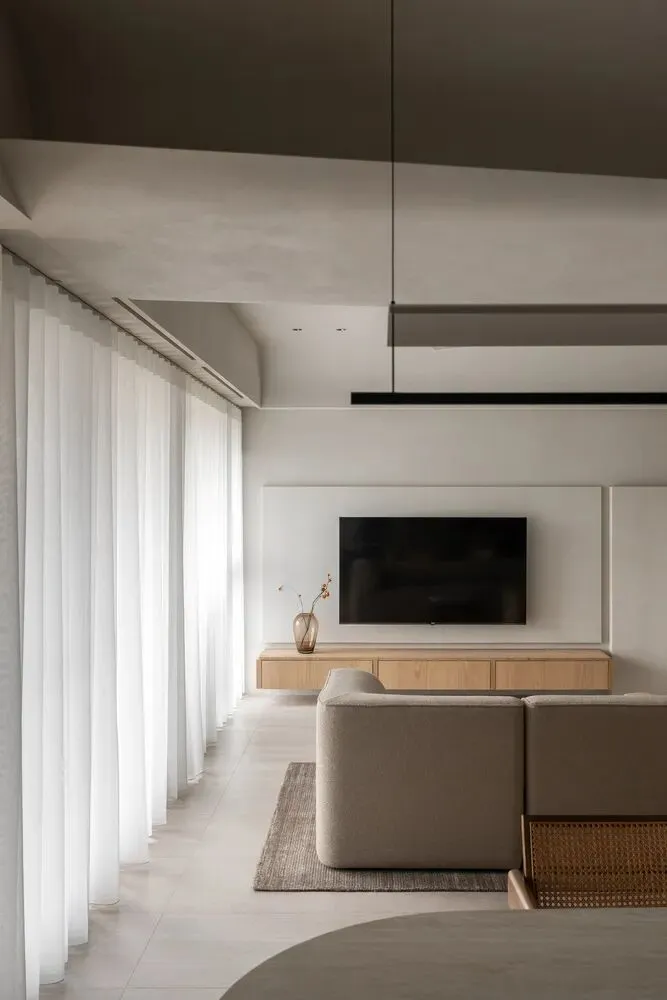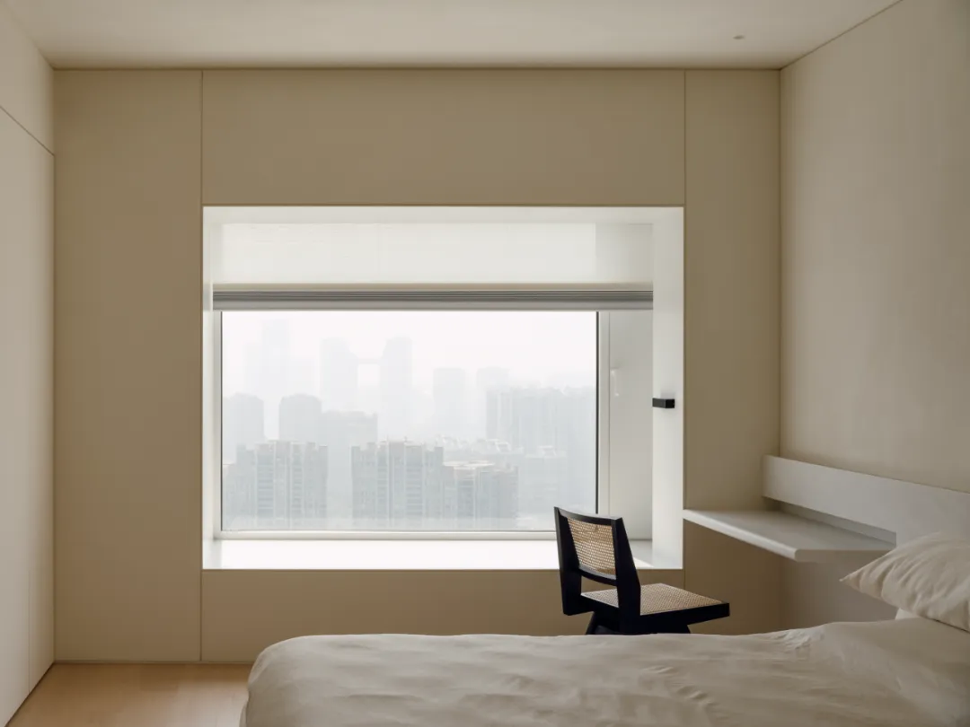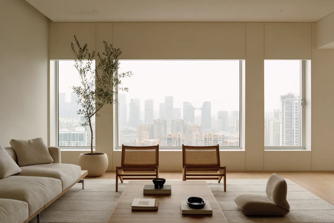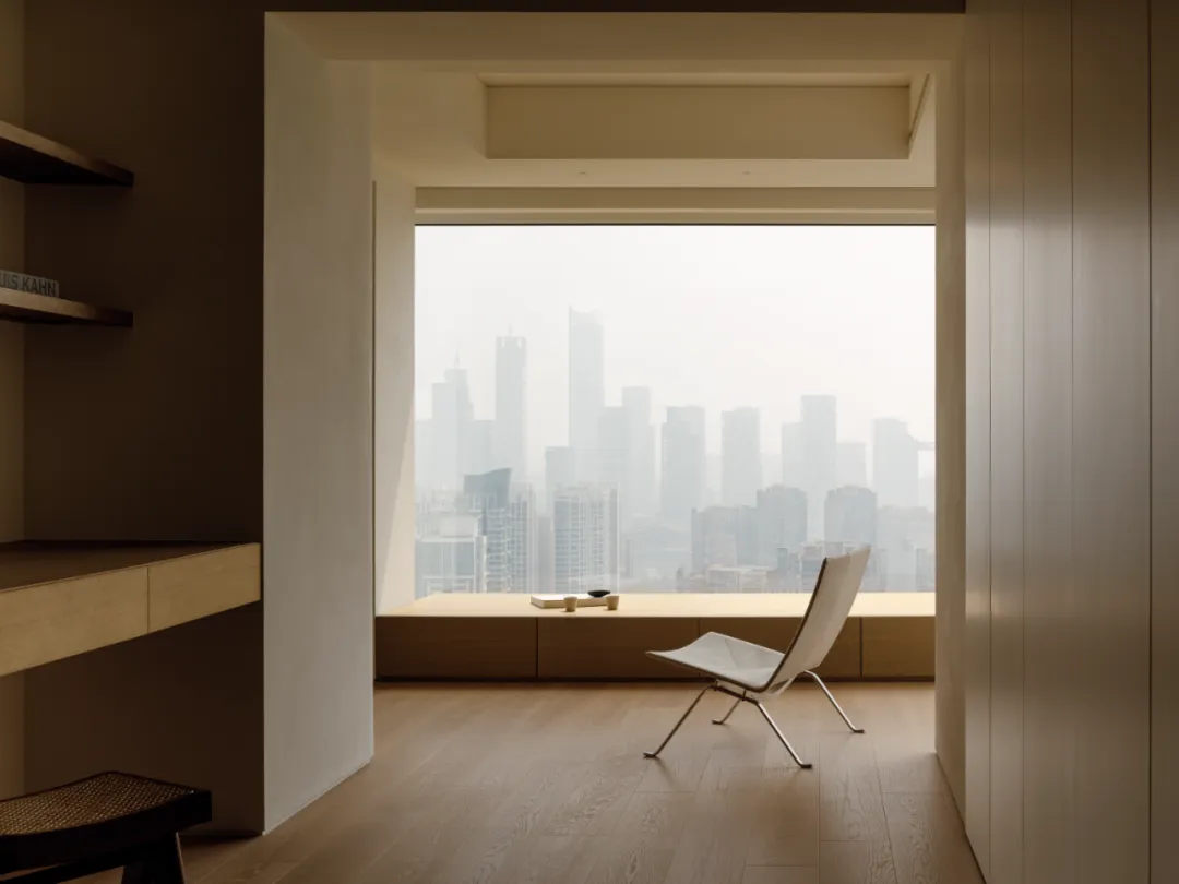 好的东西,是会引起共鸣的。好的空间,是会让人暂时卸下防备顺势躺在沙发上然后长叹一口气,让人在繁杂生活里依旧拥有一颗平静的心。当我第一次看到这个空间的时候,我感受到了洗完澡吹完头发的清爽,还有假期刚开始的松弛感,或许我们的理想不同,但那份对归处安宁的渴求始终相通。原方正客厅打通邻间与阳台,打造洄游式的空间,将电视墙连通客厅、书房与茶室;拆除玻璃隔断,扩大景观视野,日常收纳归入书房柜体,保持空间简约通透,如此一来,增添了更多不同生活场景的可能,加深生活的自在,减少生活的繁杂。广州私宅,250㎡。以城市美景作窗画,以线条描述结构,以浅色衬托色彩,以温柔赋以温度,以自然给予灵动。一切都是刚刚好。设计之前,设计师说:目前您比较喜欢什么样的生活方式或者想要参考什么样的空间案例呢?业主说:我现在就处于一个‘做减法’的人生阶段,孩子大了,家人的工作和生活也都稳定了,以前住的空间都是千家万户的大多数,现在就想改变一下,甚至是突破自己,希望给自己和家人一个全新的生活方式,如果非要我给出要求的话,我就希望我回家以后是可以赤脚走在家里,随意靠在墙边或者坐在家里的某个地方,我内心平静一点点,我的身体舒展一点点。“不设限”这三个字不仅是业主的信任,对设计师来说,动力和压力同时扑面而来。干湿分区以透光移门隔断,增设水波纹艺术移门双重闭合,日常透光通透明亮,高隐私需求时双重门全闭隔绝,满足不同人的隐私需求。△平面图