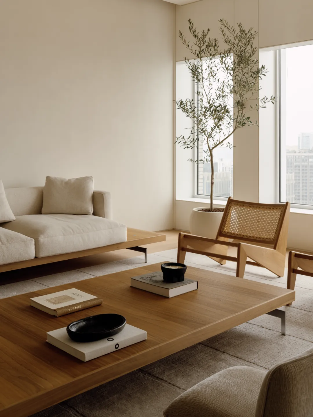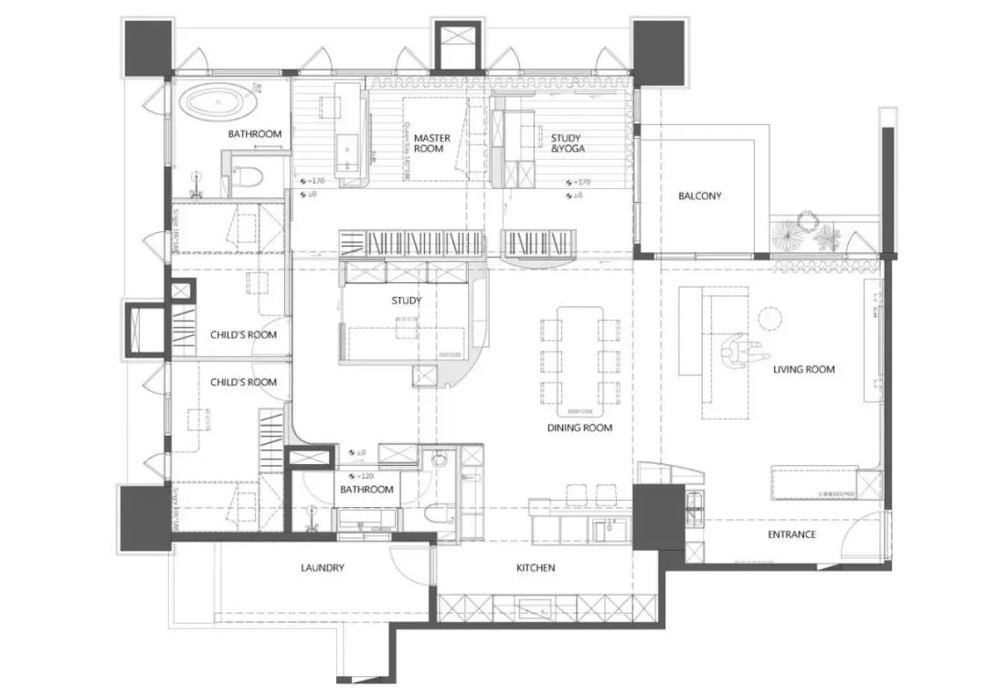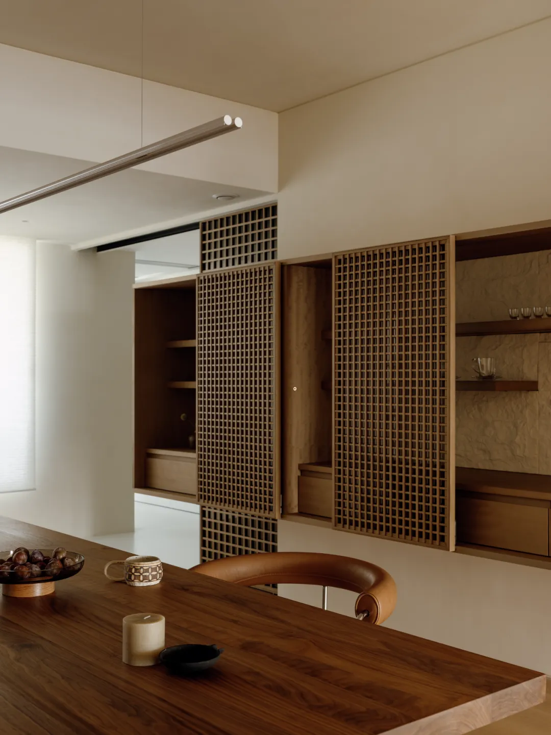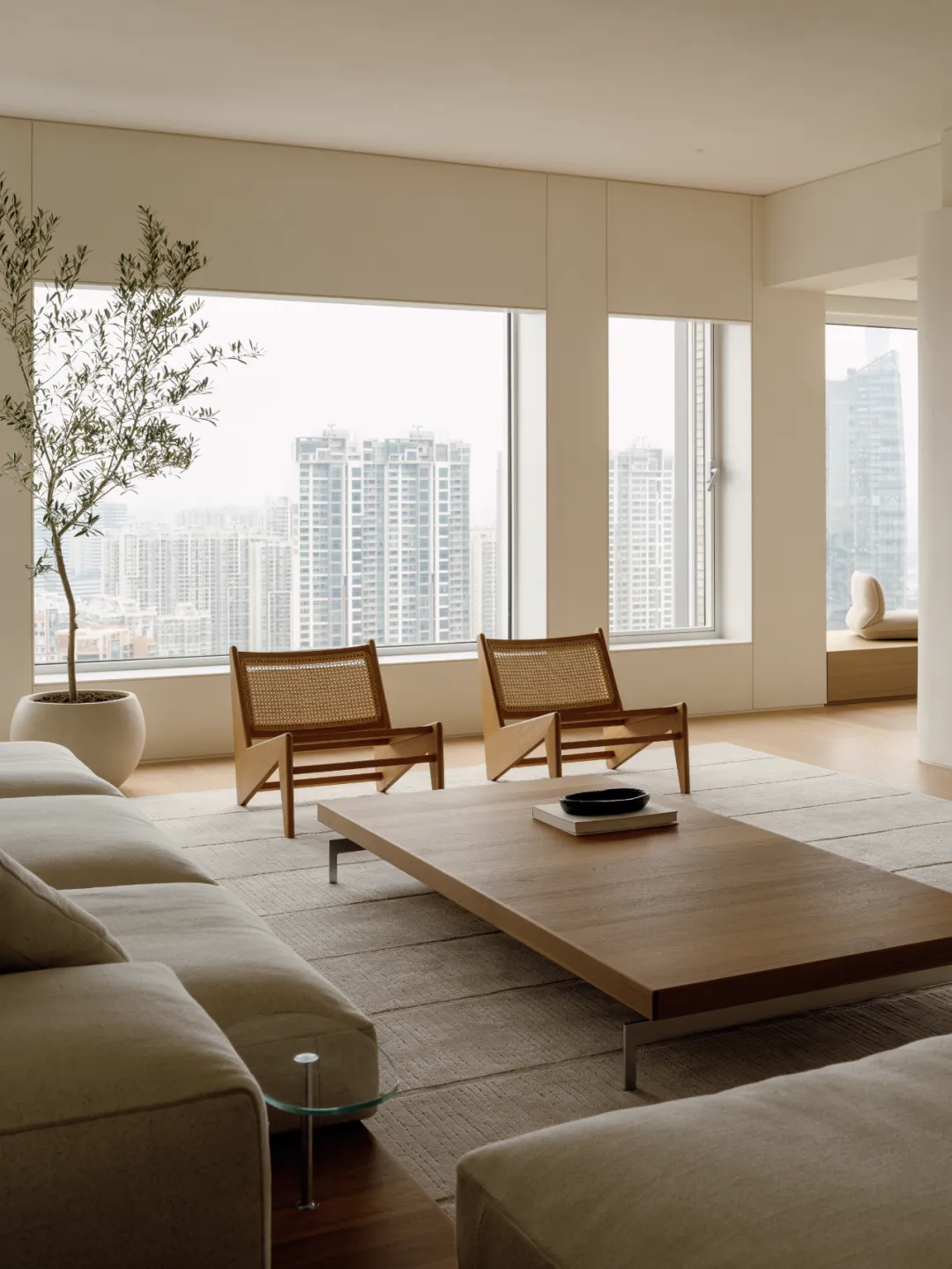 好的东西,是会引起共鸣的。好的空间,是会让人暂时卸下防备顺势躺在沙发上然后长叹一口气,让人在繁杂生活里依旧拥有一颗平静的心。当我第一次看到这个空间的时候,我感受到了洗完澡吹完头发的清爽,还有假期刚开始的松弛感,或许我们的理想不同,但那份对归处安宁的渴求始终相通。原方正客厅打通邻间与阳台,打造洄游式的空间,将电视墙连通客厅、书房与茶室;拆除玻璃隔断,扩大景观视野,日常收纳归入书房柜体,保持空间简约通透,如此一来,增添了更多不同生活场景的可能,加深生活的自在,减少生活的繁杂。广州私宅,250㎡。以城市美景作窗画,以线条描述结构,以浅色衬托色彩,以温柔赋以温度,以自然给予灵动。一切都是刚刚好。设计之前,设计师说:目前您比较喜欢什么样的生活方式或者想要参考什么样的空间案例呢?业主说:我现在就处于一个‘做减法’的人生阶段,孩子大了,家人的工作和生活也都稳定了,以前住的空间都是千家万户的大多数,现在就想改变一下,甚至是突破自己,希望给自己和家人一个全新的生活方式,如果非要我给出要求的话,我就希望我回家以后是可以赤脚走在家里,随意靠在墙边或者坐在家里的某个地方,我内心平静一点点,我的身体舒展一点点。“不设限”这三个字不仅是业主的信任,对设计师来说,动力和压力同时扑面而来。干湿分区以透光移门隔断,增设水波纹艺术移门双重闭合,日常透光通透明亮,高隐私需求时双重门全闭隔绝,满足不同人的隐私需求。△平面图