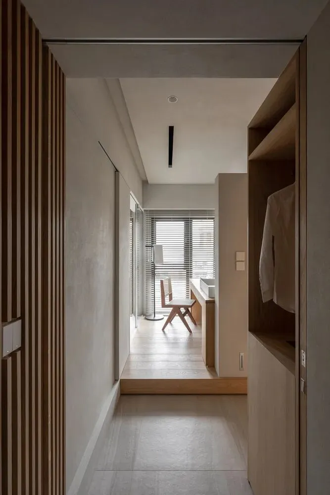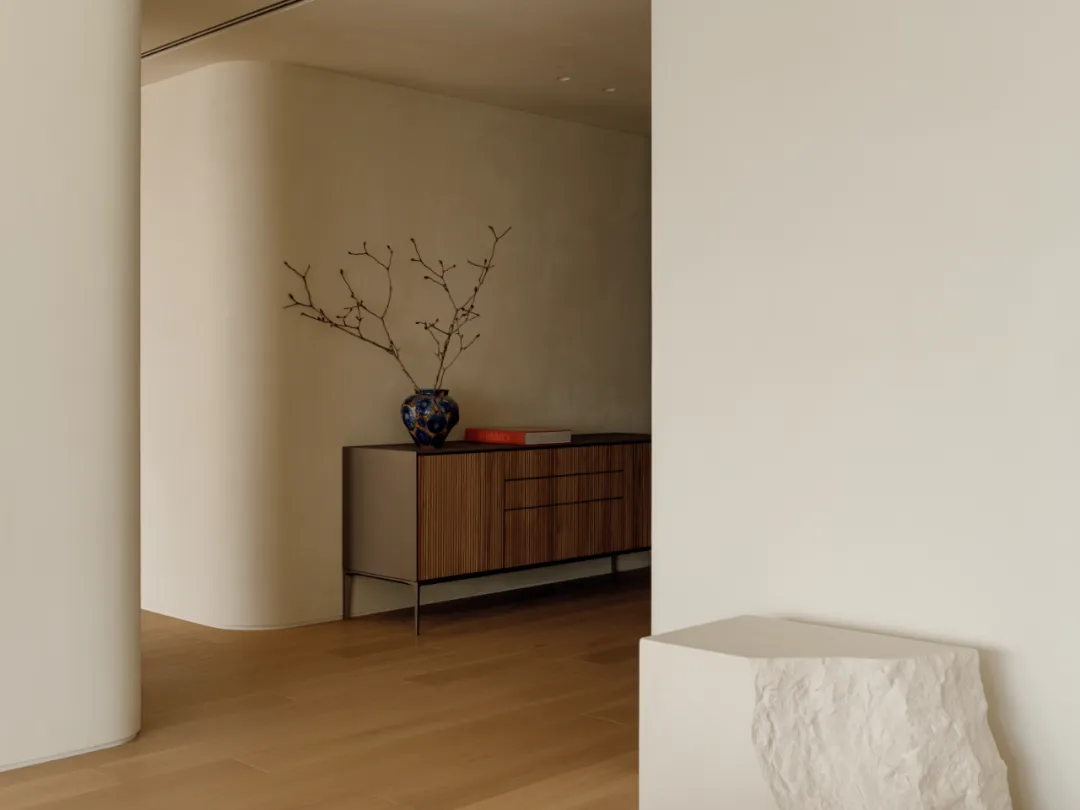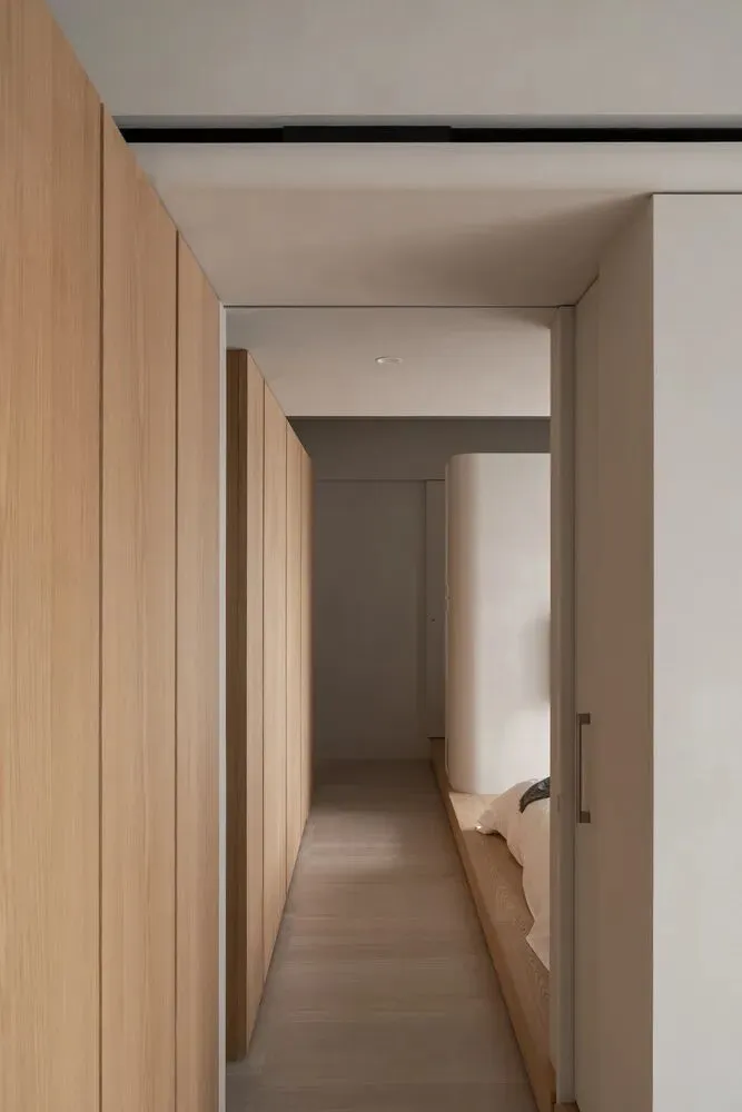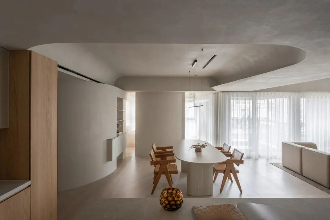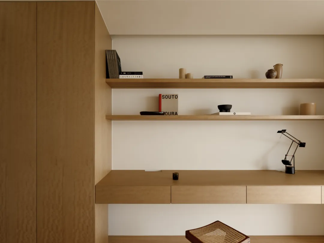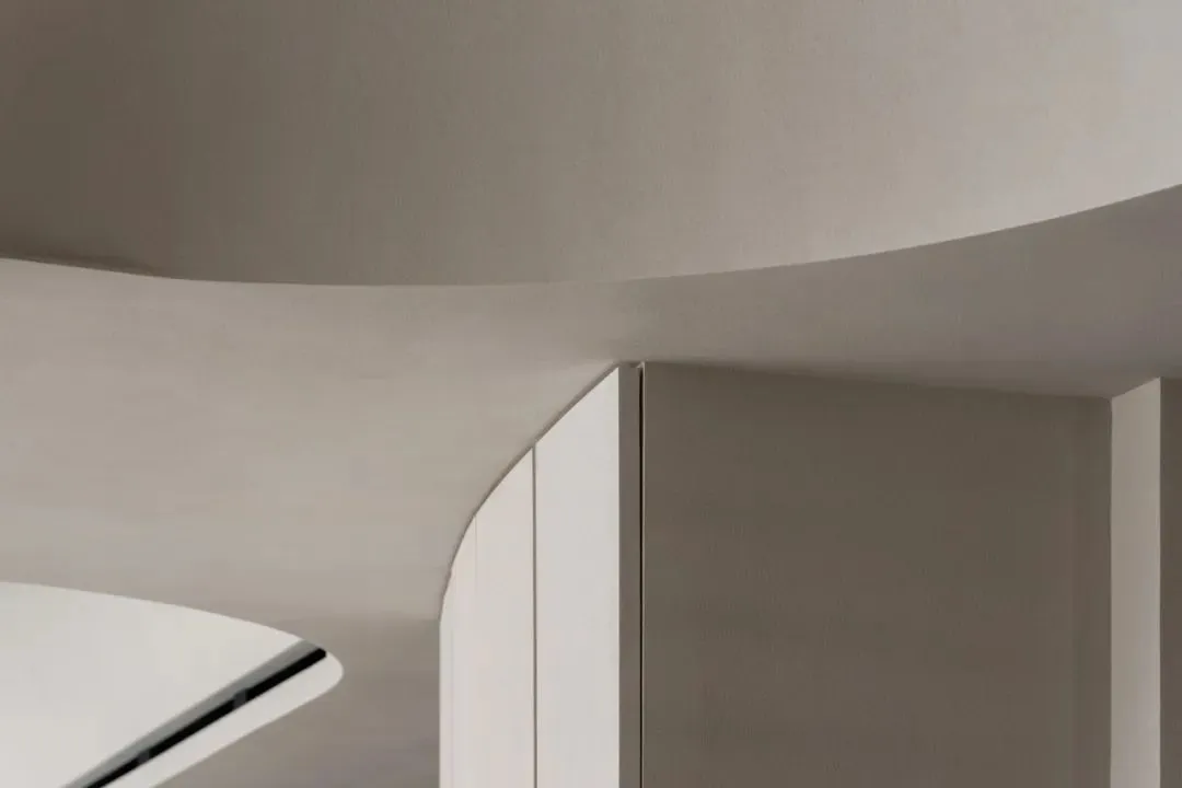 中国·桃园159㎡极简平层-Slow Rhythm考量屋主的使用习惯,将原本的三房改为四房,并面对较低的樑柱,更要思考如何在有限的范围内,确保整体舒适度与功能性。在空间操作上,天花与立面透过不同形式的弧形取代锐利的线条,让圆润的元素贯穿整个空间,从而弱化压迫感并自然引导视觉,使整体更加开阔。圆弧不仅成为结构的延伸,更是串联空间氛围的关键元素。空间配置上,以书房作为核心延伸回字动线,串连各个功能区域。主卧采用架高地坪搭配一字型的廊道,巧妙划分不同的使用空间,既保持通透感,又能有效区隔各功能使用,增强灵活性并提升空间的串联性。透过圆润的线条勾勒生活的轮廓,整体调性以温润的暖色为主,通过不同彩度的堆叠,营造丰富层次感赋予空间流动的静谧感。Global Habitat Design Awards第 | 二 | 轮 | 火 | 热 | 申 | 报 | 中