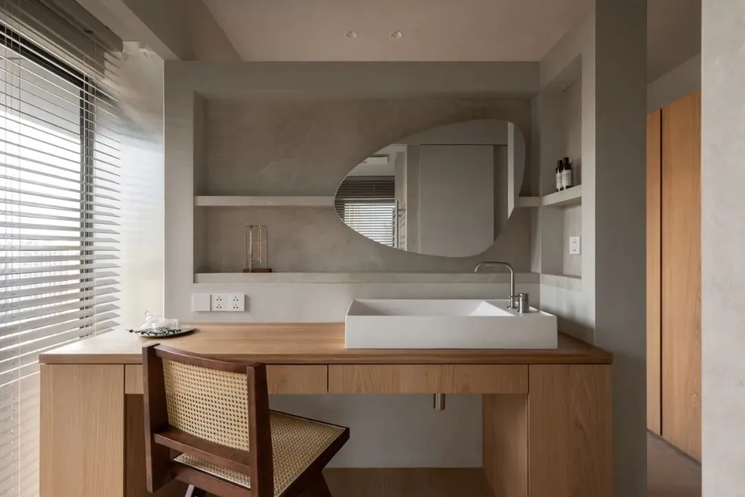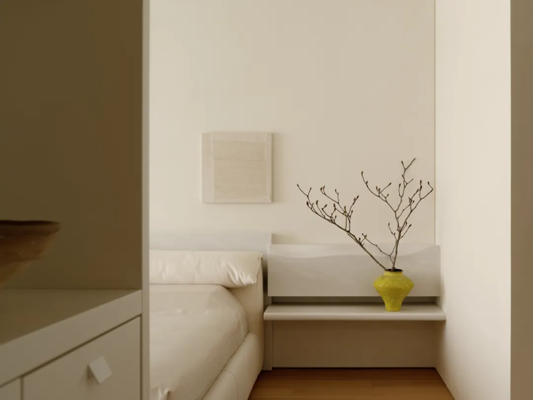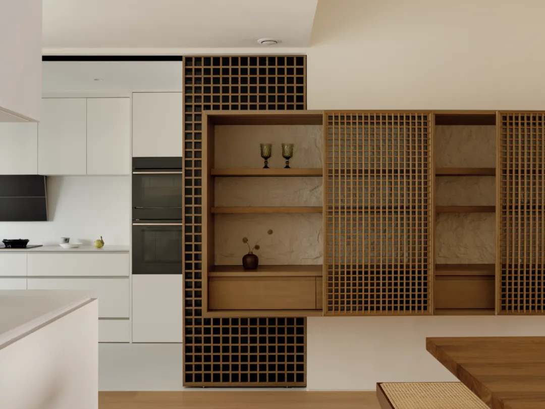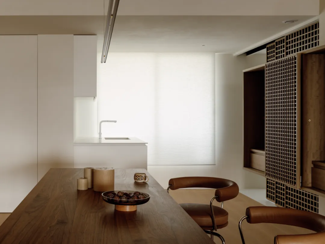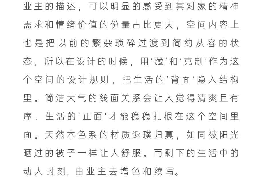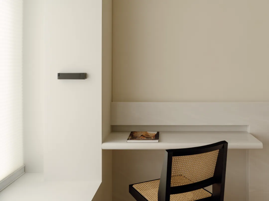 中国·桃园159㎡极简平层-Slow Rhythm考量屋主的使用习惯,将原本的三房改为四房,并面对较低的樑柱,更要思考如何在有限的范围内,确保整体舒适度与功能性。在空间操作上,天花与立面透过不同形式的弧形取代锐利的线条,让圆润的元素贯穿整个空间,从而弱化压迫感并自然引导视觉,使整体更加开阔。圆弧不仅成为结构的延伸,更是串联空间氛围的关键元素。空间配置上,以书房作为核心延伸回字动线,串连各个功能区域。主卧采用架高地坪搭配一字型的廊道,巧妙划分不同的使用空间,既保持通透感,又能有效区隔各功能使用,增强灵活性并提升空间的串联性。透过圆润的线条勾勒生活的轮廓,整体调性以温润的暖色为主,通过不同彩度的堆叠,营造丰富层次感赋予空间流动的静谧感。Global Habitat Design Awards第 | 二 | 轮 | 火 | 热 | 申 | 报 | 中