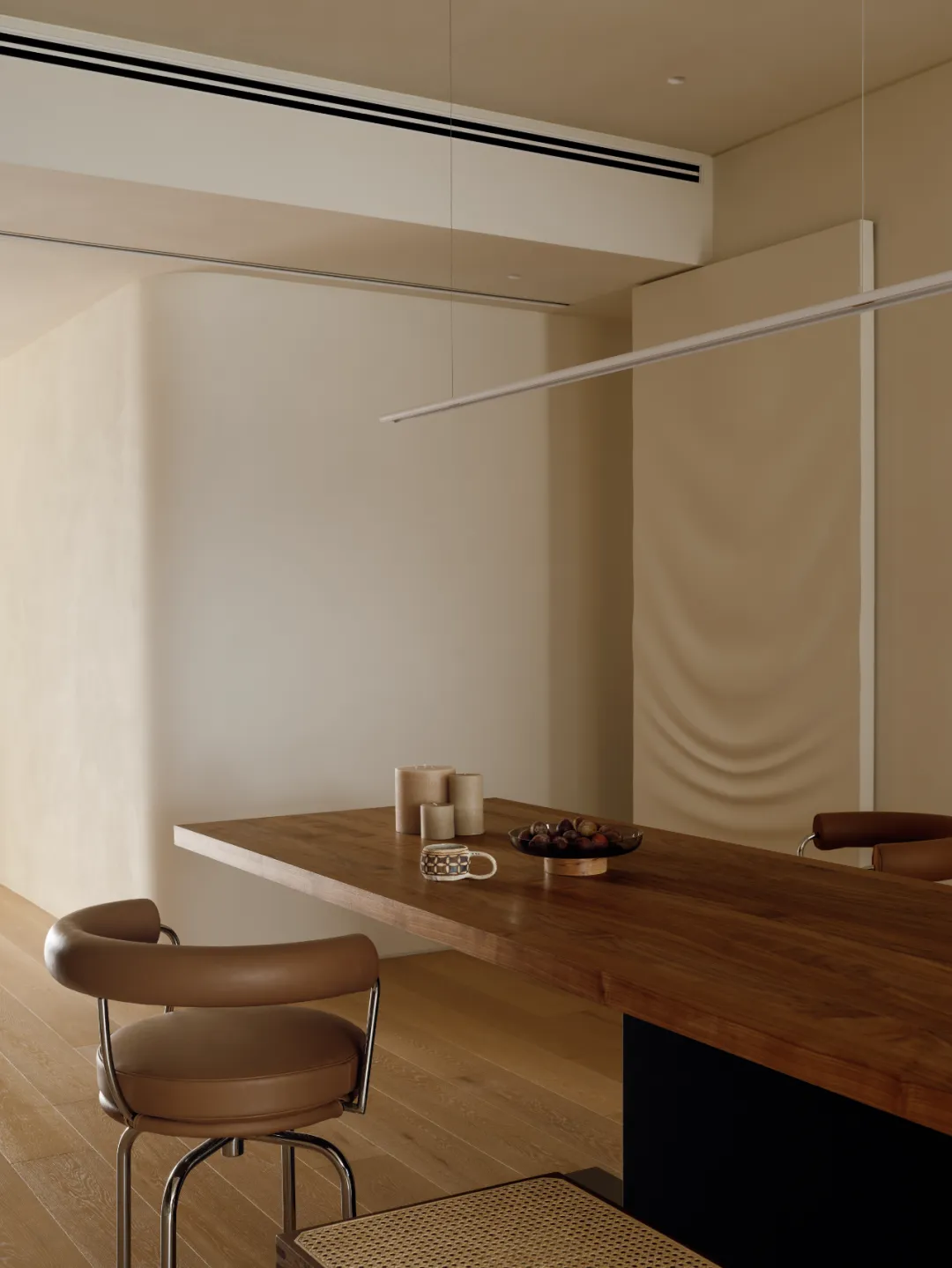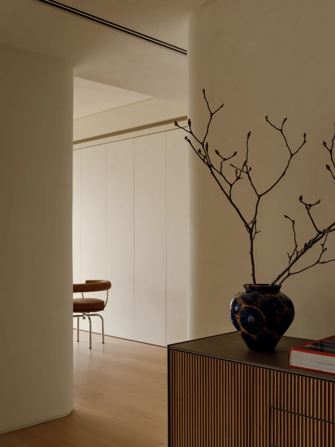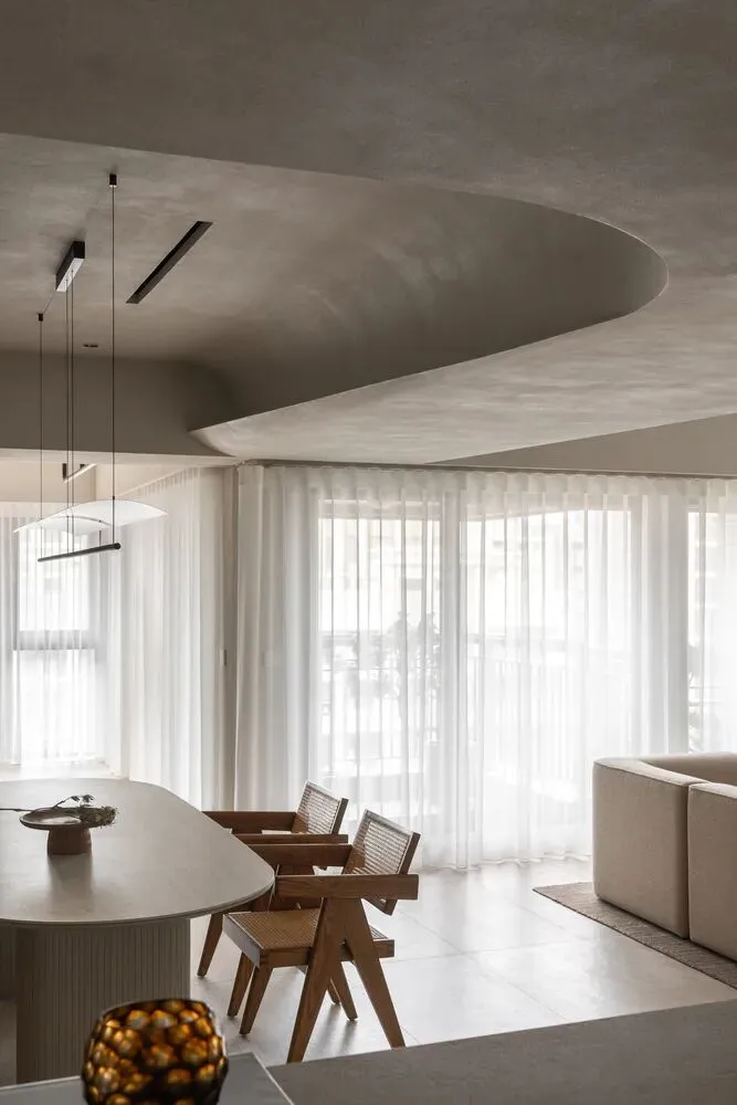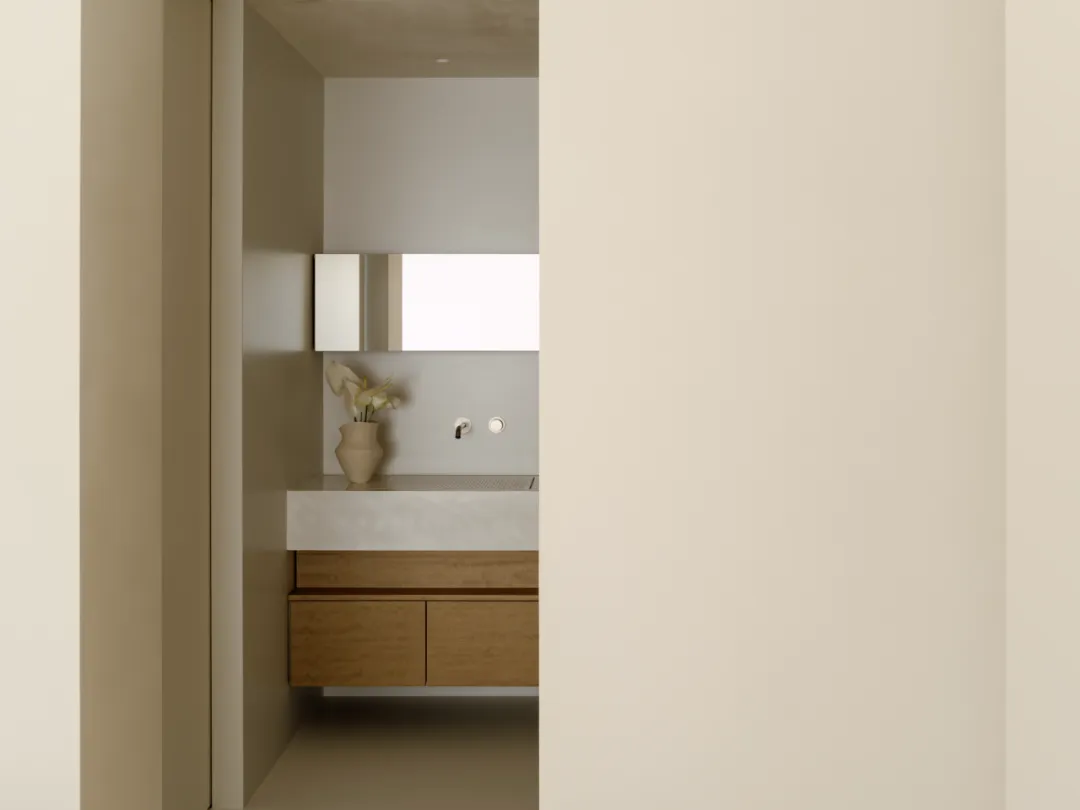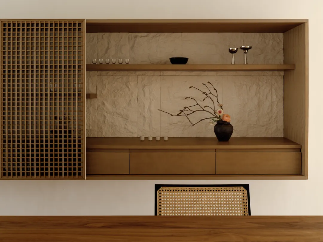 中国·桃园159㎡极简平层-Slow Rhythm考量屋主的使用习惯,将原本的三房改为四房,并面对较低的樑柱,更要思考如何在有限的范围内,确保整体舒适度与功能性。在空间操作上,天花与立面透过不同形式的弧形取代锐利的线条,让圆润的元素贯穿整个空间,从而弱化压迫感并自然引导视觉,使整体更加开阔。圆弧不仅成为结构的延伸,更是串联空间氛围的关键元素。空间配置上,以书房作为核心延伸回字动线,串连各个功能区域。主卧采用架高地坪搭配一字型的廊道,巧妙划分不同的使用空间,既保持通透感,又能有效区隔各功能使用,增强灵活性并提升空间的串联性。透过圆润的线条勾勒生活的轮廓,整体调性以温润的暖色为主,通过不同彩度的堆叠,营造丰富层次感赋予空间流动的静谧感。Global Habitat Design Awards第 | 二 | 轮 | 火 | 热 | 申 | 报 | 中