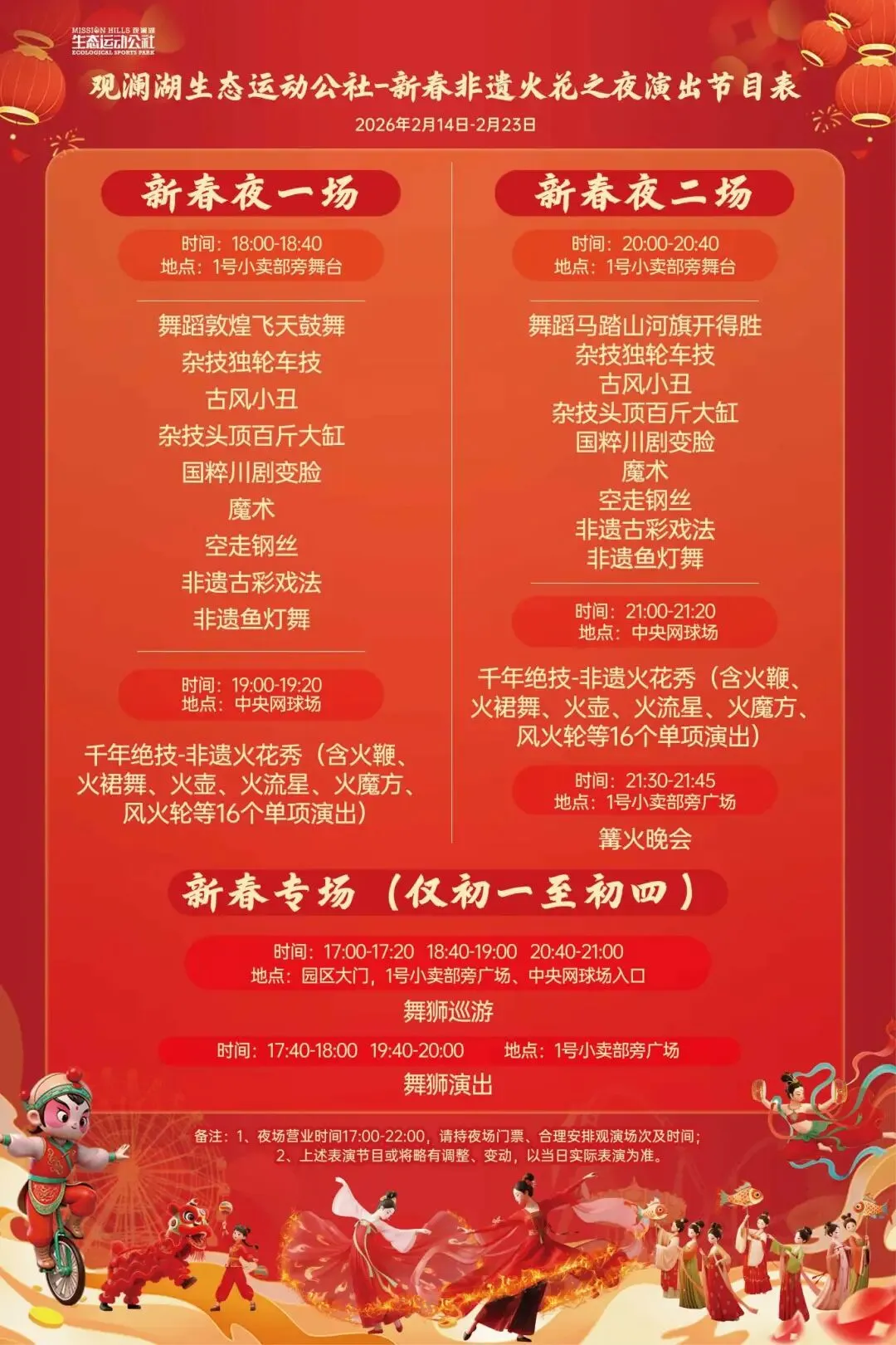 春节期间有铁花风火轮、火扇、火烛、火焰刀、火方片、火魔方、火棍、火壶、喷火等焰火表演还有敦煌飞天舞、鱼灯舞与舞狮等活动,现场还有千万盏灯和几十组灯光组成的花灯;并且今年观澜湖第十届樱花节也将在春节期间上线!