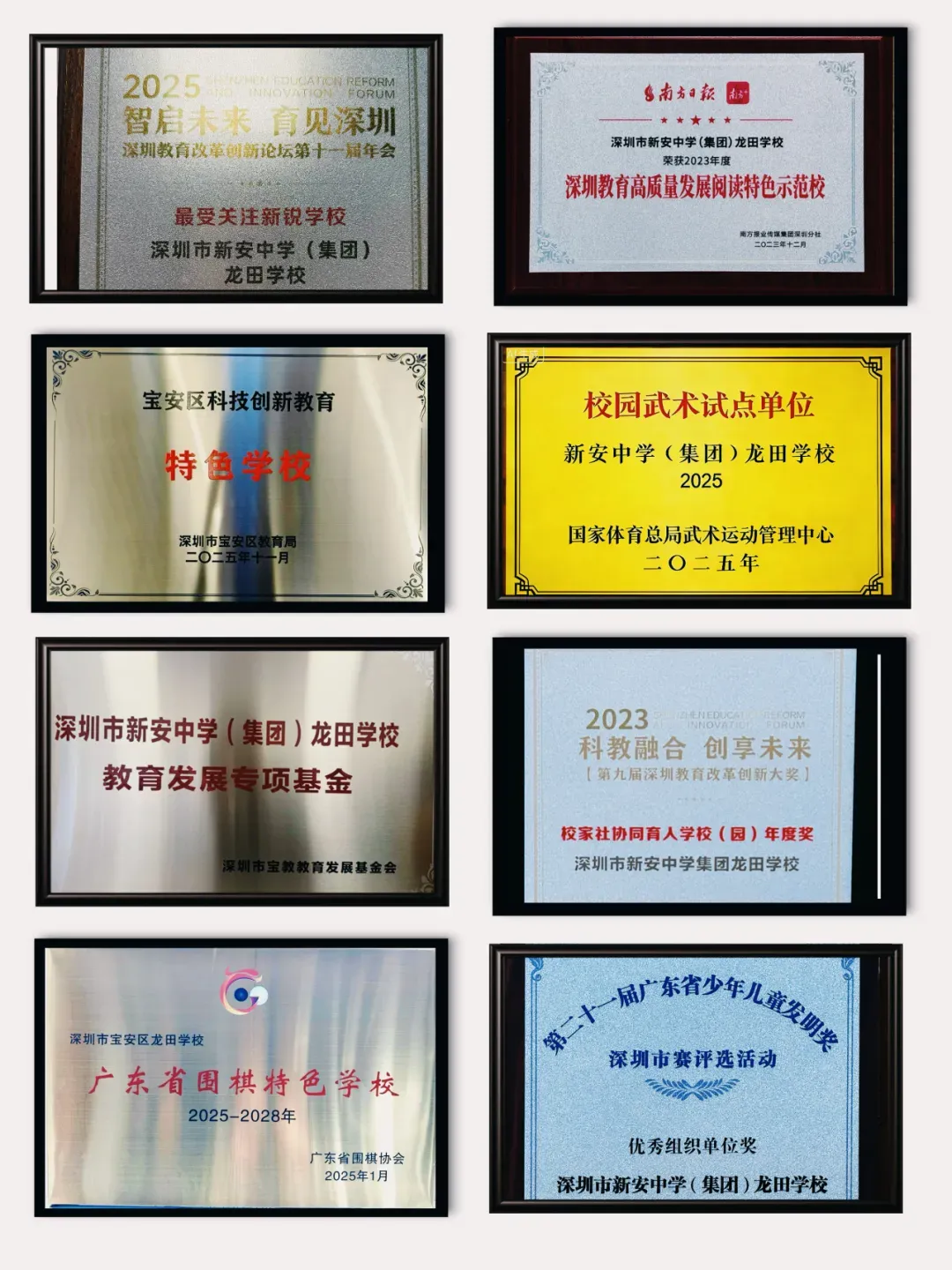 办学三年多来,深圳市新安中学(集团)龙田学校在集团“育人为本,和谐发展”办学理念引领下,取得了丰硕的办学成果:2023年12月,学校获评“深圳教育高质量发展阅读特色示范校”;2024年,先后被评为“校家社协同育人学校(园)年度奖”“广东省少年儿童发明奖优秀组织单位”“广东省特色航天航空培育学校”及“广东省围棋特色学校”;2025年,学校又获评“宝安区国际化特色学校”“宝安区劳动教育特色学校”“宝安区科技创新教育特色学校”“宝安区数字化转型标杆学校”“中华诗教综合育人项目先行学校”“校园武术试点单位”和“教育改革创新最受关注新锐学校”。此外,我校五大实验室入选深圳市“一校一馆”场馆,初中历史、综合实践学科获评“宝安区中小学学科教研基地”;在体育赛事中亦收获佳绩,先后荣获2025年“中国中学生拳击锦标赛广东·深圳站比赛体育道德风尚奖”“深圳市青少年拳击公开赛暨深港澳青少年拳击交流赛体育道德风尚奖”“广东省第二届少儿武术精英赛体育道德风尚奖”,办学质量与特色发展再获认可。
