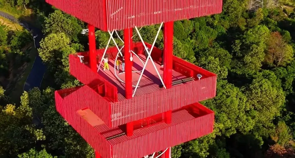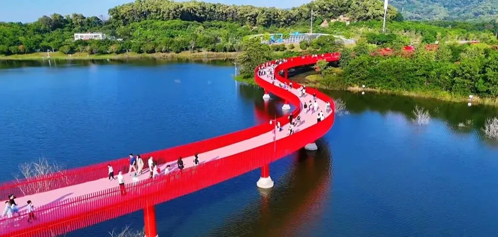 在当下快节奏的深圳生活中,总需要一处地方,让脚步稍加停顿慢下来,让内心回归大自然。如果要寻找一座治愈系的地标,那便是光明区的虹桥公园,它有着4公里长的红色空中栈桥,被誉为光明红丝带,蜿蜒穿梭于苍翠山林间,成为无数深圳人周末放空的首选之地。 它也是国内第二大钢结构单柱多曲景观桥,桥面坡度平缓,无障碍友好 。