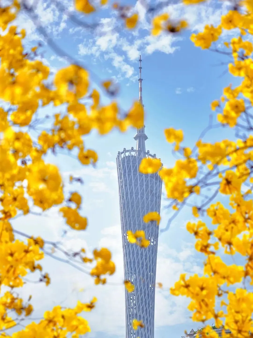 ✨ 特色:天桥旋转楼梯是最佳机位,可拍摄黄花风铃木与广州塔合影