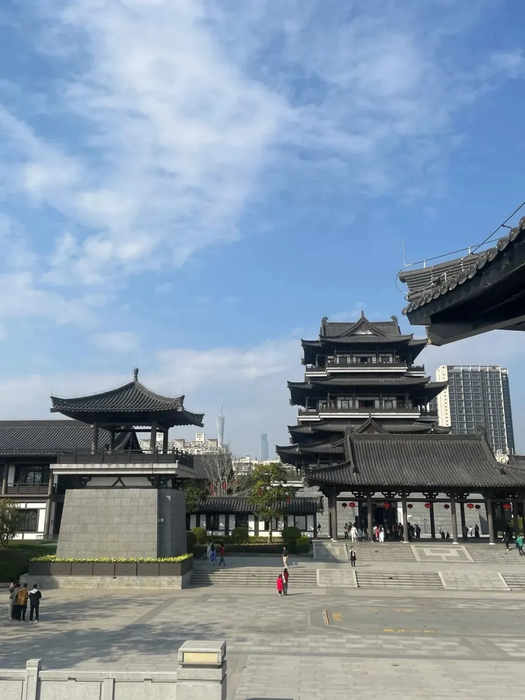 清晨的阳光斜照在中心阁的琉璃瓦上,泛起金光。我选择工作日一早前来,避开了人群,独享这片天地。39米高的中心阁是园内的制高点,乘电梯直上五楼,整个文化馆的壮丽景色尽收眼底。远眺可见广州塔婀娜的身姿,近观则是层层叠叠的岭南建筑,古今交融的景象令人惊叹。